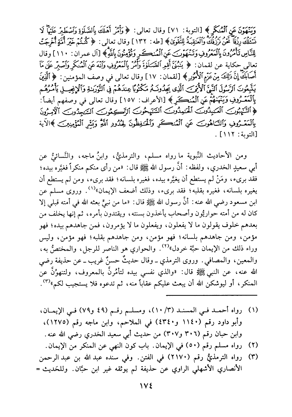 ومِن الأحاديث النبوية ما رواه مسلم، والترمذي، وابن ماجه، والنسائي عن أبي سعيد الخدري، ولفظه: أن رسول الله صلى الله عليه وسلم قال: "من رأى منكم منكراً فغيَّره بيده؛ فقد برئ، ومن لم يستطع أن يغيره بيده، فغيره بلسانه؛ فقد برئ، ومن لم يستطع أن يغيره بلسانه، فغيره بقلبه؛ فقد برئ، وذلك أضعف الأيمان" 1. وروى مسلم عن ابن مسعود رضي الله عنه: أن رسول الله صلى الله عليه وسلم قال: "ما من نبي بعثه الله في أمته قبلي إلا كان له من أمته حواريُّون وأصحاب يأخذون بسنته، ويقتدون بأمره، ثم إنها يخلف من بعدهم خلوف يقولون ما لا يفعلون، ويفعلون ما لا يؤمرون، فمن جاهدهم بيده؛ فهو مؤمن، ومن جاهدهم بلسانه؛ فهو مؤمن، ومن جاهدهم بقلبه؛ فهو مؤمن، وليس وراء ذلك من الإيمان حبة خردل" 2. والحواري هو الناصر للرجل، والمختص به، والمعين، والمصافي. وروى الترمذي -وقال حديث حسن غريب- عن حذيفة رضي الله عنه، عن النبي صلى الله عليه وسلم قال: "والذي نفسي بيده لتأمُرنَّ بالمعروف، ولتنهوُنَّ عن المنكر، أو ليوشكن الله أن يبعث عليكم عقاباً منه، ثم تدعوه فلا يستجيب لكم" 3.
