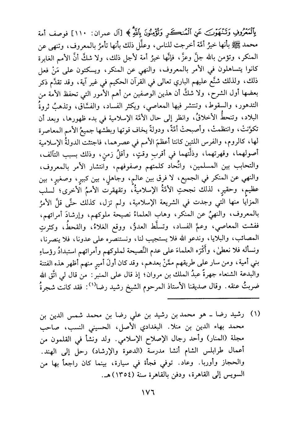 بِالْمَعْرُوفِ وَتَنْهَوْنَ عَنِ الْمُنْكَرِ وَتُؤْمِنُونَ بِاللَّهِ} [آل عمران:110] فوصف أمة محمد صلى الله عليه وسلم بأنها خيرأمة أُخرجت للناس، وعلل ذلك بأنها تأمر بالمعروف، وتنهى عن المنكر، وتؤمن بالله جل وعز، فإنها خيرأمة لأجل ذلك، ولا شك أن الأمم الغابرة كانوا يتساهلون في الأمر بالمعروف، والنهي عن المنكر، ويسكتون على من فعل ذلك، ولذلك شنَّع عليهم الباري تعالى في القرآن الحكيم في غيرآية، وقد تقدم ذكر بعضها أول الشرح، ولا شك أن هذين الوصفين من أهم الأمور التي تحفظ الأمة من التدهور، والسقوط، وتنتشر فيها المعاصين ويكثر الفساد، والفساق، وتذهب ثروة البلاد، وتنحط الأخلاق، وانظر إلى حال الأمة الإسلامية في بدء ظهورها، وبعد أن تكونت، وانتظمت، وأصبحت أمة، ودولة يخاف قوتها وبطشها جميع الأمم المعاصرة لها، كالروم، والفرس اللتين كانتا أعظم الأمم في عصرهما، فاجتثت الدولة الإسلامية أصولهما، وقهرتهما، وذلتهما في أقرب وقت، وأقل زمن، وذلك بسبب التآلف، والتحابب بين المسلمين، واتِّحاد كلمتهم وصفوفهم، وانتشار الأمر بالمعروف، والنهي عن المنكر في الجميع، لا فرق بين عالم، وجاهل، بين كبير، وصغير، وبين عظيم، وحقير، لذلك نجحت الأمة الإسلامية، وتقهقرت الأمم الأخرى؛ لسلب المزايا منها التي وجدت في الشريعة الإسلامية، ولم تزل، كذلك حتى قل الأمر بالمعروف، والنهي عن المنكر، وهاب العلماء نصيحة ملوكهم، وإرشاد أمرائهم، ففشت المعاصي، وعمَّ الفساد، وتسلط العدو، ووقع الغلاء، والقحط، وكثرت المصائب، والبلايا، وندعو الله فلا يستجيب لنا، ونستنصره على عدونا، فلا ينصرنا، ونسأله فلا نعطى، وأكره العلماء على عدم النصيحة لملوكهم وأمرائهم استبداد رؤساء بني أمية، ومن سارعلى طريقهم ممن بعدهم، وقد كان أول أمير منهم أظهر هذه الفتنة والبدعة الشنعاء جهرةً عبد الملك بن مروان؛ إذ قال على المنبر: من قال لي اتقِ الله ضربت عنقه. وقال صديقنا الأستاذ المرحوم الشيخ رشيد رضا1: فقد كانت شجرة