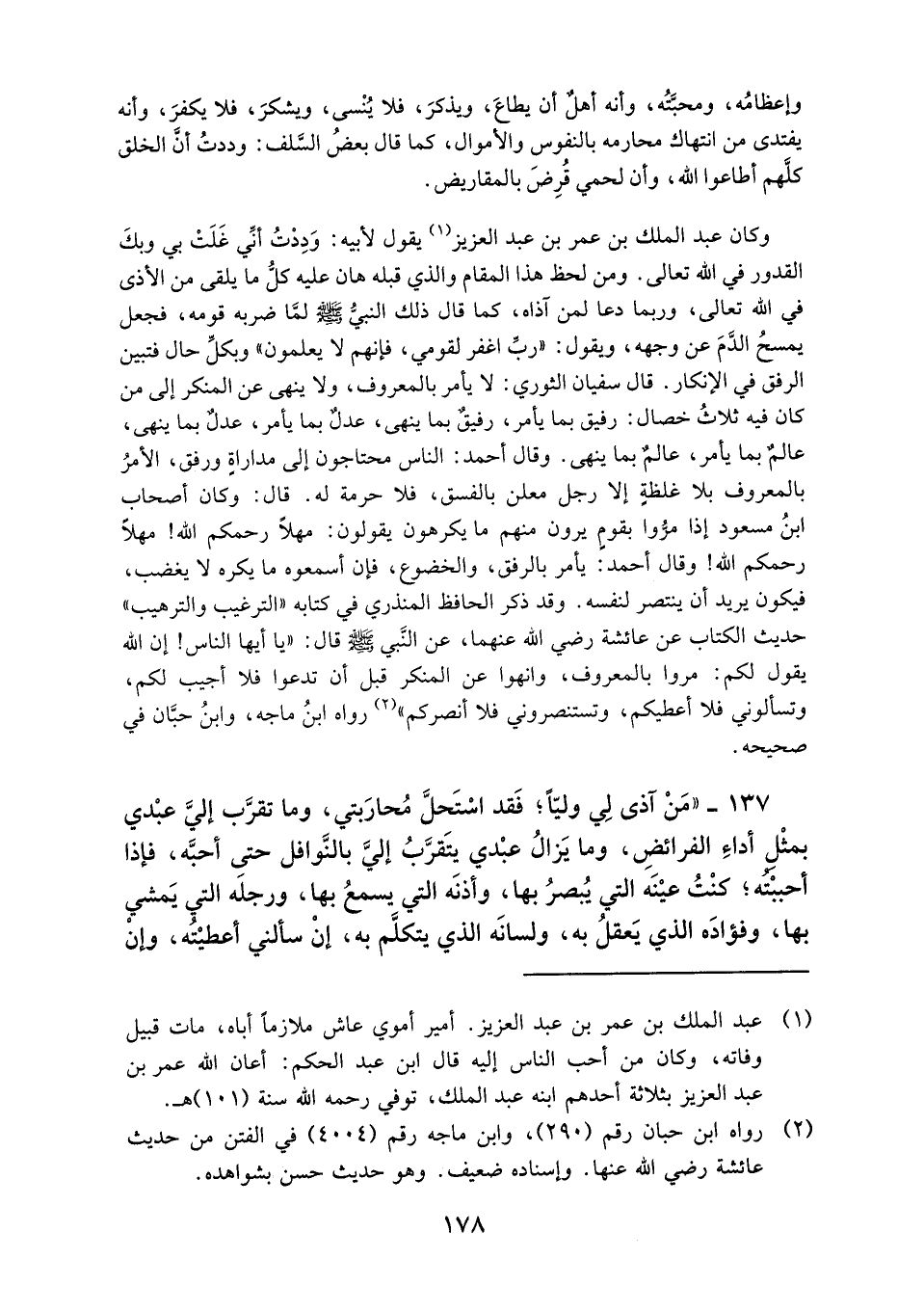 137- "من آذى لي ولياً؛ فقد استحل محاربتي، وما تقرَّب إلى عبدي بمثل أداء الفرائض، وما يزال عبدي يتقرب إلى بالنوافل حتى أحبِّه، فإذا أحببته؛ كنت عينه التي يبصر بها، وأذنه التي يسمع بها، ورجله التي يمشي بها، وفؤاده الذي يعقل به، ولسانه الذي يتكلم به، إن سألني أعطيته، وإنْ