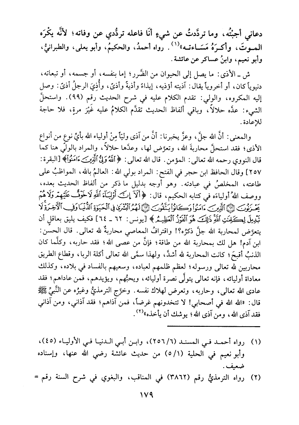 ش- الأذى: ما يصل إلى الحيوان من الضرر؛ إما بنفسه، أو جسمه، أو تبعاته، دنيوياً كان، أوأخروياً يُقال: آذيته أؤذيه، إيذاءً وأذيةً وأذى، وأذى الرجل أذى: وصل إليه المكروه، والولي: تقدم الكلام عليه في شرح الحديث رقم"99". واستحلَّ الشيء: عدَّه حلالاً، وباقي ألفاظ الحديث تقدم الكلام عليه غير مرة، فلاحاجة للإعادة.