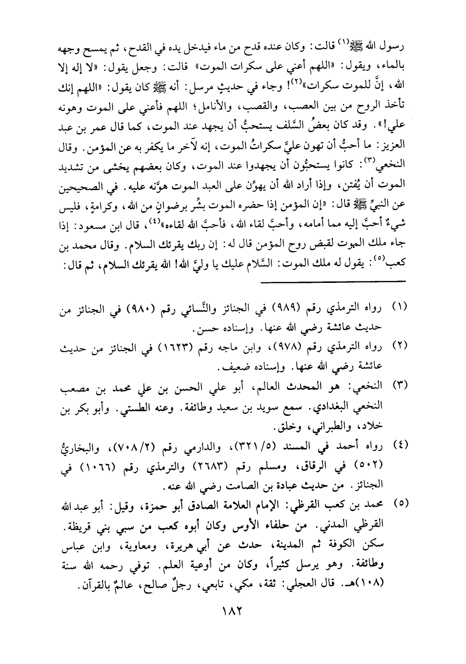 رسول الله صلى الله عليه وسلم1 قالت: وكان عنده قدح من ماء فيدخل يده في القدح، ثم يمسح وجهه بالماء، ويقول: "اللهم أعنِّي على سكرات الموت" قالت: وجعل يقول: "لا إله إلا الله، إن للموت سكرات"2! وجاء في حديث مرسل: أنه صلى الله عليه وسلك كان يقول: "اللهم إنك تأخذ الروح من بين العصب، والقصب، والأنامل؛ اللهم فأعني على الموت وهونه علي! ". وقد كان بعض السلف يستحب أن يجهد عند الموت، كما قال عمر بن عبد العزيز: ما أحب أن تهون علي سكرات الموت، إنه لآخر ما يكفر به عن المؤمن. وقال النخعي3: كانوا يستحبون أن يجهدوا عند الموت، وكان بعضهم يخشى من تشديد الموت أن يُفتن، وإذا أراد الله أن يهوِّن على العبد الموت هونه عليه. في الصحيحين عن النبي صلى الله عليه وسلم قال: "إن المؤمن إذا حضره الموت بُشِّر برضوان من الله، وكرامة، فليس شيء أحب إليه مما أمامه، وأحب لقاء الله، فأحب الله لقاءه"4، قال ابن مسعود: إذا جاء ملك الموت لقبض روح المؤمن قال له: إن ربك يقرئك السلام. وقال محمد بن كعب5. يقول له ملك الموت: السلام عليك يا ولي الله! الله يقرئك السلم، ثم قال: