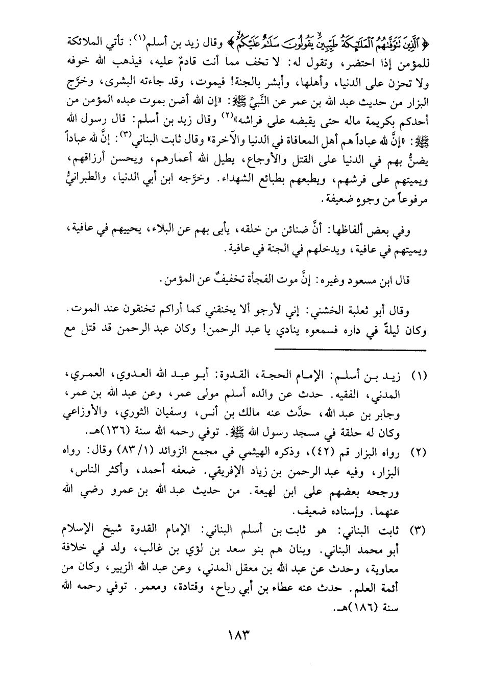 {الَّذِينَ تَتَوَفَّاهُمُ الْمَلائِكَةُ طَيِّبِينَ يَقُولُونَ سَلامٌ عَلَيْكُمُ} وقال زيد بن أسلم1: تأتي الملائكة للمؤمن إذا احتضر، وتقول له: لاتخف مما أنت قادم عليه، فيذهب الله خوفه ولا تحزن على الدنيا، وأهلها، وأبشر بالجنة! فيموت، وقد جاءته البشرى، وخرج البزار من حديث عبد الله بن عمر عن النبي صلى الله عليه وسلم: "إن الله أضن بموت عبده المؤمن من أحدكم بكريمة ماله حتى يقبضه على فراشه"2 وقال زيد بن أسلم: قال رسول الله صلى الله عليه وسلم: "إن لله عباداً هم أهل المعافاة في الدنيا والآخرة" وقال ثابت البناني3: إن لله عباداً يضن بهم في الدنياعلى القتل والأوجاع، يطيل الله أعمارهم، ويحسن أرزاقهم، ويميتهم على فرشهم، وبطبعهم بطبائع الشهداء. وخرَّجه ابن أبي الدنيا، والطبراني مرفوعاً من وجوه ضعيفة.