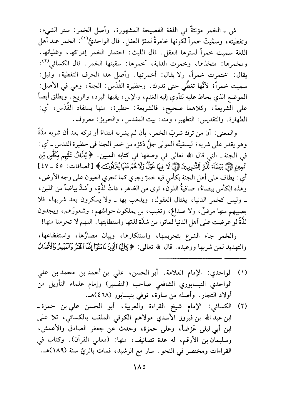 ش- الخمر مؤنثه في اللغة الفصيحة المشهورة، وأصل الخمر: سترالشيء، وتغطيته، وسُميت خمراً؛ لكونها خامرة لمقرالعقل. قال الواحدي1: الخمرعند أهل اللغة سميت خمراً؛ لسترها العقل. قال الليث: اختمار الخمر إدراكها، وغليانها، ومخمرها: متخذها، وخمرت الدابة، أخمرها: سقيتها الخمر. قال الكسائي2: يقال: اختمرت خمراً، ولا يقال: أخمرتها. وأصل هذا الحرف التغطية، وقيل: سميت خمراً؛ لأنها تغطِّي حتى تدرك. وحظيرة القدس: الجنة، وهي في الأصل: الموضع الذي يحاط عليه لتأوي إليه الغنم، والإبل، يقيها البرد، والريح. ويطلق أيضاً على الشريعة، وكلاهما صحيح، فالشريعة: حظيرة، منها يُستفاد القدس، أي: الطهارة. والتقديس: التطهير، ومنه: بيت المقدس، والحرير: معروف.