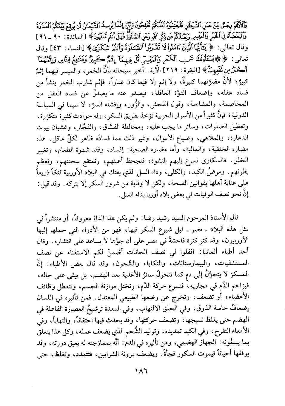 قال الأستاذ المرحوم السيد رشيد رضا: ولم يكن هذا الداء معروفاً، أو منتشراً في مثل هذه البلاد -مصر- قبل شيوع السكر فيها، فهو من الأدواء التي حملها إليها الأوروبيون، وقد كثُر كثرة فاحشة في مصرعلى أن جوها لا يساعد على انتشاره. وقال أحد أطباء ألمانيا: اقفلوا لي نصف الحانات أضمن لكم الاستغناء عن نصف المستشفيات، والبيمارستانات، والتكايا، والسجون، وقد قال بعض الأطباء: إن المسكر لا يتحول إلى دم كما تتحول سائر الأغذية بعد الهضم، بل يبقى على حاله، فيزاحم الدم في مجاريه، فتسرع حركة الدم، وتختل موازنة الجسم، وتتعطل وظائف الأعضاء، أو تضعف، وتخرج عن وضعها الطبيعي المعتدل. فمن تأثيره في اللسان إضعاف حاسة الذوق، وفي الحلق الالتهاب، وفي المعدة ترشيح العصارة الفاعلة في الهضم حتى يغلظ نسيجها، وتضعف حركتها، وقد يحدث فيها احتقاناً، والتهاباً، وفي الأمعاء التقرح، وفي الكبد تمديده، وتوليد الشَّحم الذي يضعف عمله، وكل هذا يتعلق بما يسمونه: الجهاز الهضمي، ومن تأثيره في الدم: أنه بممازجته له يعيق دورته، وقد يوقفها أحياناً فيموت السكورفجأة. ويضعف مرونة الشرايين، فتمدد، وتغلظ، حتى