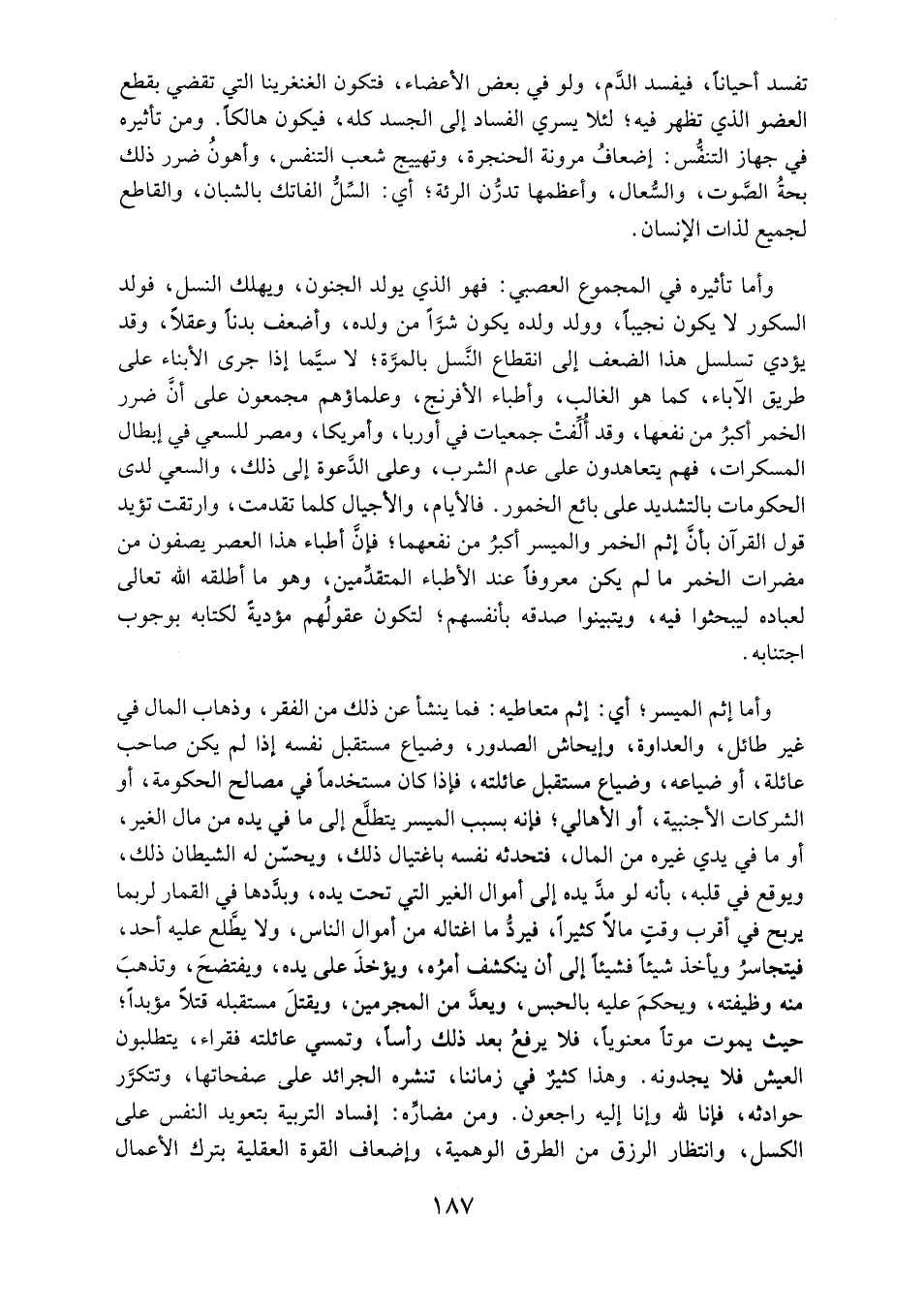 وأما تأثيره في المجموع العصبي: فهو الذي يولد الجنون، ويهلك النسل، فولد السكور لا يكون نجيباً، وولد ولده يكون شراً من ولده، وأضعف بدناً وعقلاً، وقد يؤدي تسلسل هذا الضعف إلى انقطاع النسل بالمرة؛ لا سيما إذا جرى الأبناء على طريق الآباء، كما هو الغالب، وأطباء الأفرنج، وعلماؤهم مجمعون على أن ضرر الخمر أكبر من نفعها، وقد أُلِّفت جميعات في أوربا، وأمريكا، ومصر للسعي في إبطال المسكرات، فهم يتعاهدون على عدم الشرب، وعلى الدعوة إلى ذلك، والسعي لدى الحكومات بالتشديد على بائع الخمور. فالأيام، والأجيال كلما تقدمت، وارتقت تؤيد قول القرآن بأن إثم الخمر والميسر أكبر من نفعهما؛ فإن أطباء هذا العصر يصفون من مضرات الخمرما لم يكن معروفاًً عند الأطباء المتقدمين، وهو ما أطلقه الله تعالى لعباده؛ليبحثوا فيه، ويتبينوا صدقه بأنفسهم؛ لتكون عقولهم مؤدية لكتابه بوجوب اجتنابه.