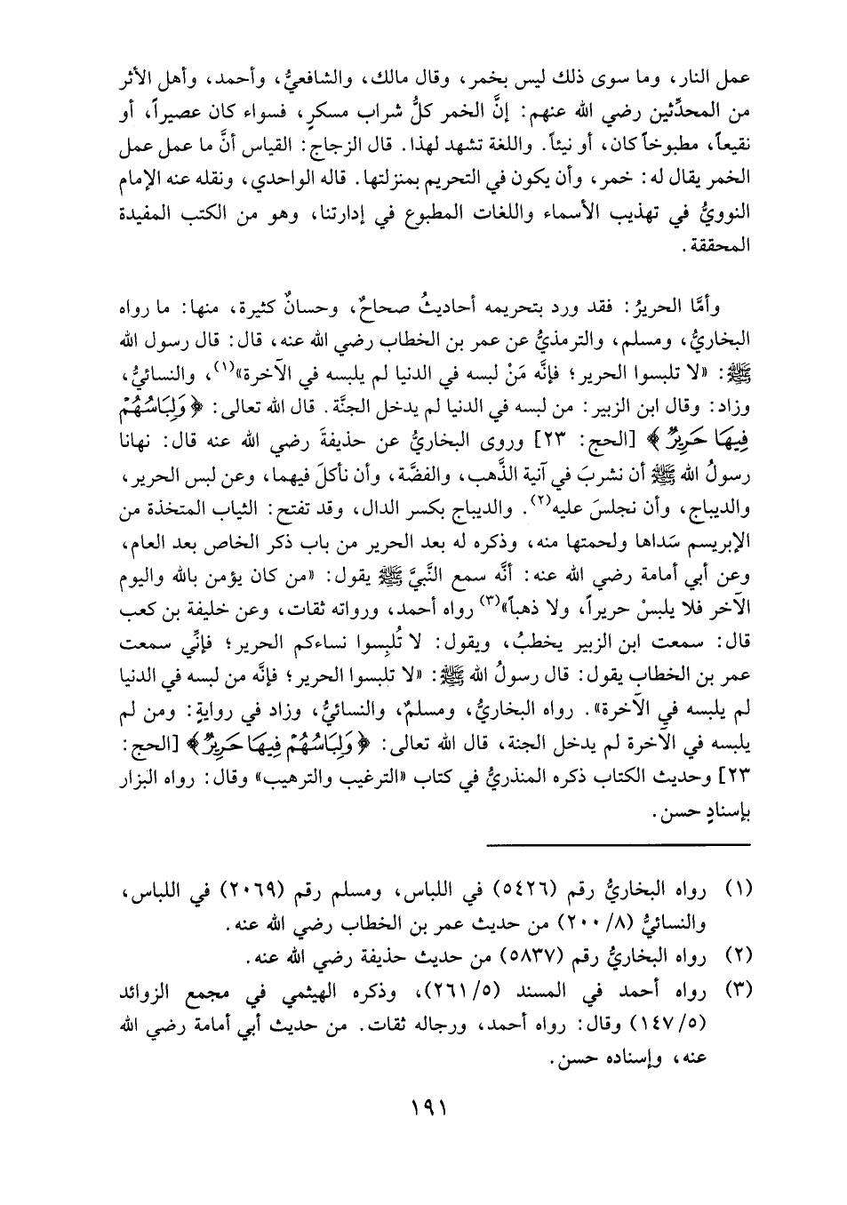 وأما الحرير: فقد ورد بتحريمه أحاديث صحاحٌ، وحسانٌ كثيرة، منها: ما رواه البخاري، ومسلم، والترمذي عن عمر بن الخطاب رضي الله عنه، قال: قال رسول الله صلى الله عليه وسلم: "لا تلبسوا الحرير؛ فإنه من لبسه في الدنيا لم يلبسه في الآخرة" 1، والنسائي، وزاد: وقال ابن الزبير: من لبسه في الدنيا لم يدخل الجنة. قال الله تعالى: {وَلِبَاسُهُمْ فِيهَا حَرِيرٌ} [الحج:23] وروى البخاري عن حذيفة رضي الله عنه قال: "نهانا رسول الله صلى الله عليه وسلم أن نشرب في آنية الذهب، والفضة، وأن نأكل فيهما، وعن لبس الحرير، والديباج، وأن نجلس عليه" 2. والديباج بكسر الدال، وقد تفتح: الثياب المتخذة من الإبريسم سَداها، ولحمتها منه، وذكره له بعد الحرير من باب ذكر الخاص بعد العام، وعن أبي أمامة رضي الله عنه: أنه سمع النبي صلى الله عليه وسلم يقول: "من كان يؤمن بالله واليوم الآخر فلا يلبس حريرًا، ولا ذهبًا" 3 رواه أحمد، ورواته ثقات، وعن خليفة بن كعب عمر بن الخطاب يقول: قال رسول الله صلى الله عليه وسلم: "لا تلبسوا الحرير؛ فإنِّه من لبسه في الدنيا لم يلبسه في الآخرة ". رواه البخاري، ومسلم، والنسائي، وزاد في رواية: ومن لم يلبسه في الآخرة لم يدخل الجنة، قال الله تعالى: {وَلِبَاسُهُمْ فِيهَا حَرِيرٌ} [الحج: 23] وحديث الكتاب ذكره المنذري في كتاب "الترغيب والترهيب" وقال: رواه البزار بإسنادٍ حسن.