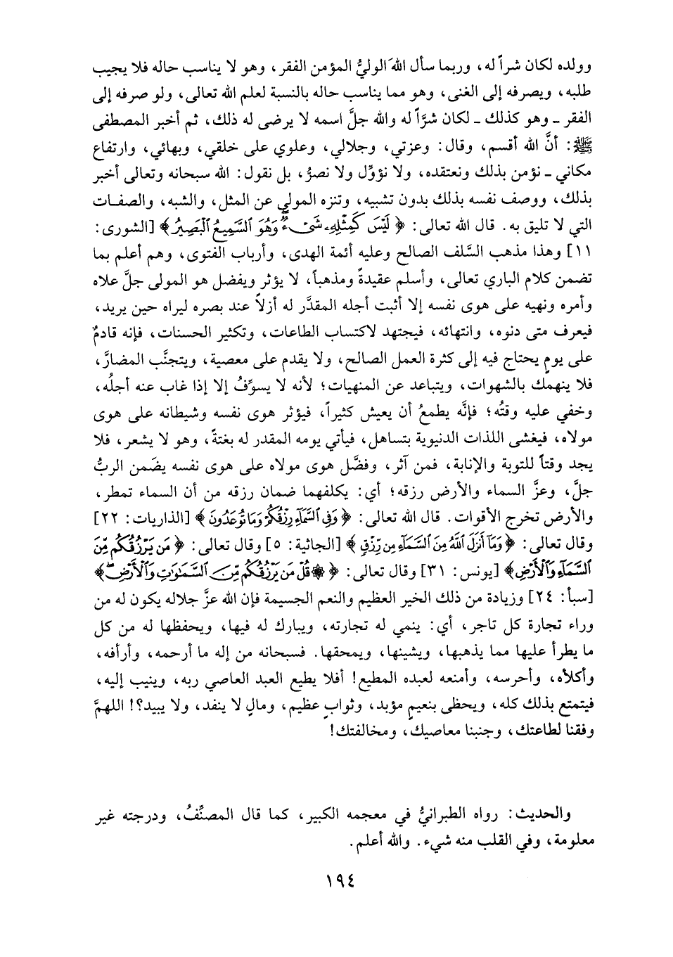 وولده لكان شرًا له، وربما سأل الله الولي المؤمن الفقر، وهولا يناسب حاله فلا يجيب طلبه، ويصرفه إلى الغنى، وهو مما يناسب حاله بالنسبة لعلم الله تعالى، ولو صرفه إلى الفقر -وهوكذلك- لكان شرًا له والله جل اسمه لا يرضى له ذلك، ثم أخبر المصطفى صلى الله عليه وسلم: أن الله أقسم، وقال: وعزتي، وجلالي، وعلوي على خلقي، وبهائي، وارتفاع مكاني -نؤمن بذلك ونعتقده، ولا نؤوِّل ولا نصر، بل نقول: الله سبحانه وتعالى أخبر بذلك، ووصف نفسه بذلك بدون تشبيه، وتنزه المولى عن المثل، والشبه، والصفات التي لا تليق به. قال الله تعالى: {لَيْسَ كَمِثْلِهِ شَيْءٌ وَهُوَ السَّمِيعُ الْبَصِيرُ} [الشورى:11] وهذا مذهب السلف الصالح،وعليه أئمة الهدى، وأرباب الفتوى، وهم أعلم بما تضمن كلام الباري تعالى، وأسلم عقيدة ومذهبًا، لا يؤثر ويفضل هو المولى جل علاه وأمره ونهيه على هوى نفسه إلا أثبت أجله المقدرله أزلاًعند بصره ليراه حين يريد، فيعرف متى دنوه، وانتهائه، فيجتهد لاكتساب الطاعات، وتكثيرالحسنات، فإنه قادم على يوم يحتاج فيه إلى كثرة العمل الصالح، ولا يقدم على معصية، ويتجنب المضار، فلا ينهمك بالشهوات، ويتباعد عن المنهيات؛ لأنه لا يسوِّف إلا إذا غاب عنه أجله، وخفي عليه وقته؛ فإنه يطمع أن يعيش كثيراً، فيُؤْثر هوى نفسه وشيطانه على هوى مولاه، فيغشى اللذات الدنيوية بتساهل، فيأتي يومه المقدر له بغتةً، وهو لا يشعر، فلا يجد وقتاً للتوبة والإنابة، فمن آثر، وفضل هوى مولاه على هوى نفسه يضمن الرب جل، وعز السماء والأرض رزقه؛ أي: يكلفهما ضمان رزقه من أن السماء تمطر، والأرض تخرج الأوقات. قال الله تعالى: {وَفِي السَّمَاءِ رِزْقُكُمْ وَمَا تُوعَدُونَ} [الذاريات:22] ،وقال تعالى: {وَمَا أَنْزَلَ اللَّهُ مِنَ السَّمَاءِ مِنْ رِزْقٍ} [يونس:31] ،وقال تعالى: {قُلْ مَنْ يَرْزُقُكُمْ مِنَ السَّمَاوَاتِ وَالْأَرْضِ} [سبأ:24] وزيادة من ذلك الخير العظيم والنعم الجسيمة فإن الله عز جلاله يكون له من وراء تجارة كل تاجر، أي: ينمي له تجارته، ويبارك له فيها، ويحفظها له من كل ما يطرأ عليها مما يذهبها، ويشينها، ويمحقها. فسبحانه من إله ما أرحمه، وأرأفه!، وأكلأه، وأحرسه، وأمنعه لعبده المطيع! أفلا يطيع العبد العاصي ربه، وينيب إليه، فيتمتع بذلك كله، ويحظى بنعيم مؤبد، وثواب عظيم، ومال لا ينفد، ولا يبيد؟! اللهم وفقنا لطاعتك، وجنبنا معاصيك، ومخالفتك!