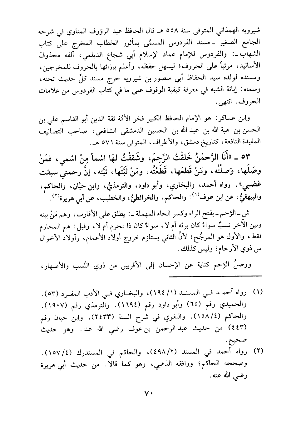 53- "أنا الرحمن خلقت الرَّحم، وشققت لها اسمًا من اسمي، فمن وصلها، وصلته، ومن قطعها، قطعته، ومن ثبَّتها، ثبَّته، إن رحمتي سبقت غضبي". رواه أحمد، والبخاري، وأبو داود، والترمذي، وابن حبان، والحاكم، والبيهقي عن ابن عوف1: والحاكم، والخرائطي، والخطيب، عن أبي هريرة2.