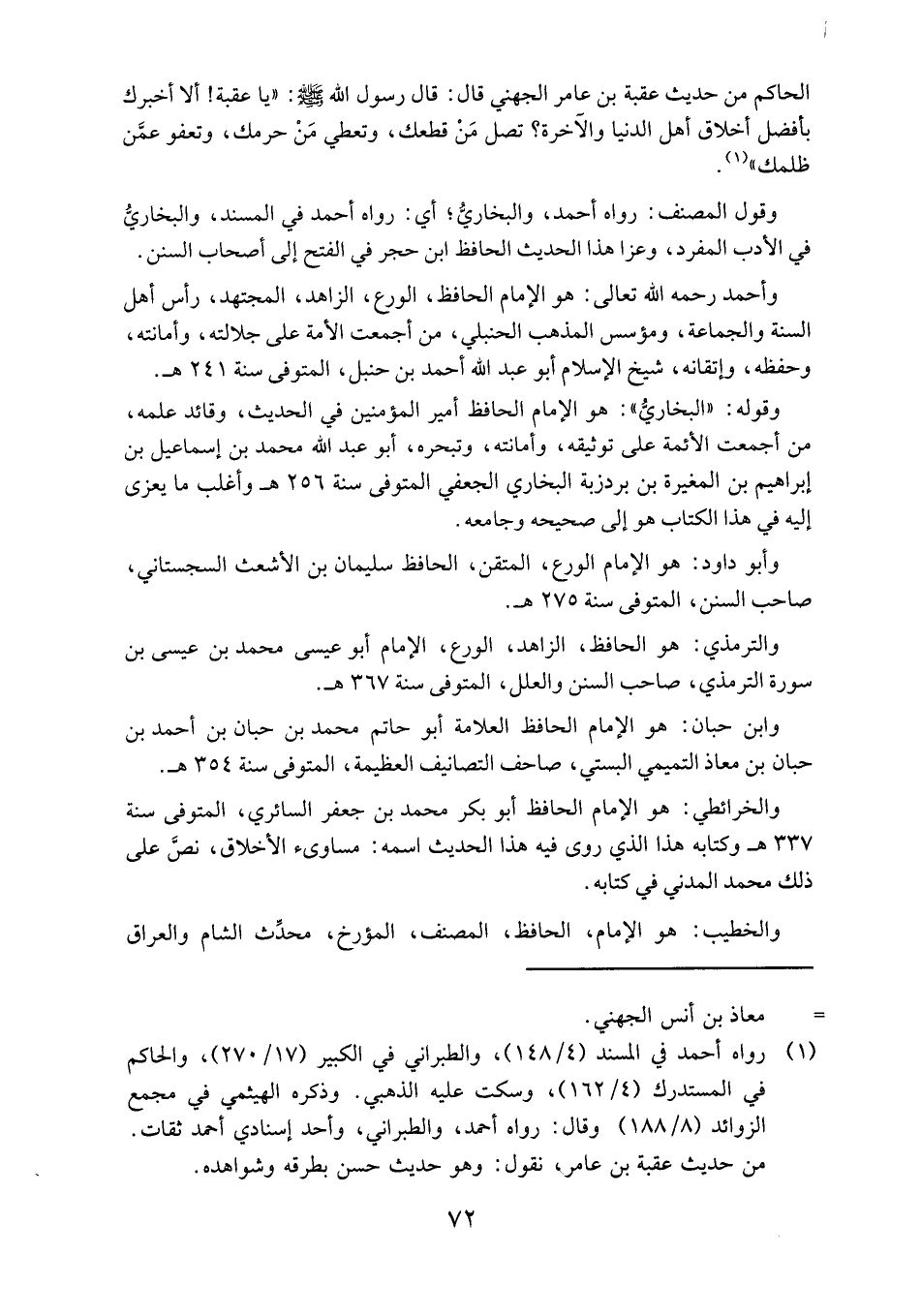1 رواه أحمد في المسند "4/ 148" والطبراني في الكبير"17/ 270"، والحاكم في المستدرك"4/ 162"، وسكت عليه الذهبي. وذكره الهيثمي في مجمع الزوائد" 8/ 188"وقال: رواه أحمد، والطبراني، وأحد إسنادي أحمد ثقات. من حديث عقبة بن عامر، نقول: وهو حديث حسن بطرقه وشواهد.