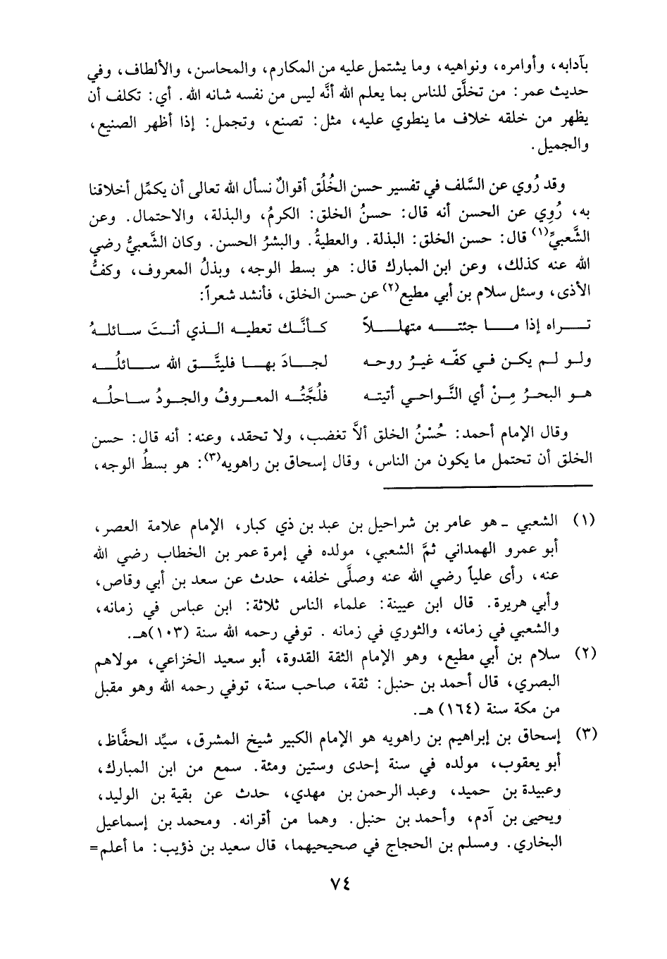 وقال الإمام أحمد: حُسن الخلق ألا تغضب، ولا تحقد، وعنه: أنه قال: حسن الخلق أن تحتمل ما يكون من الناس، وقال إسحاق بن راهوية3:هو بسط الوجه،