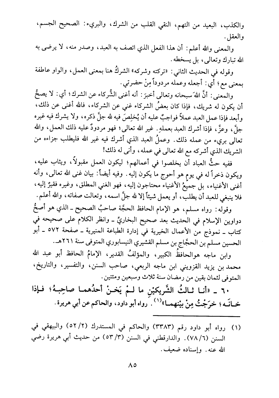 60- "أنا ثالث الشريكين ما لم يخن أحدهما صاحبه؛ فإذا خانه؛ خرجت من بينهما"1. رواه أبو داود، والحاكم عن أبي هريرة.