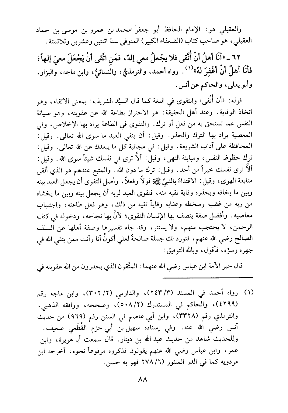 62- "أنا أهلُ أن أُتَّقى فلا يجعل معي إله، فمن اتقى أن يجعل معي إلها؛ فأنا أهل أن أغفر له" 1. رواه أحمد، والترمذي، والنسائي، وابن ماجه، والبزار، وأبو يعلى، والحاكم عن أنس.
