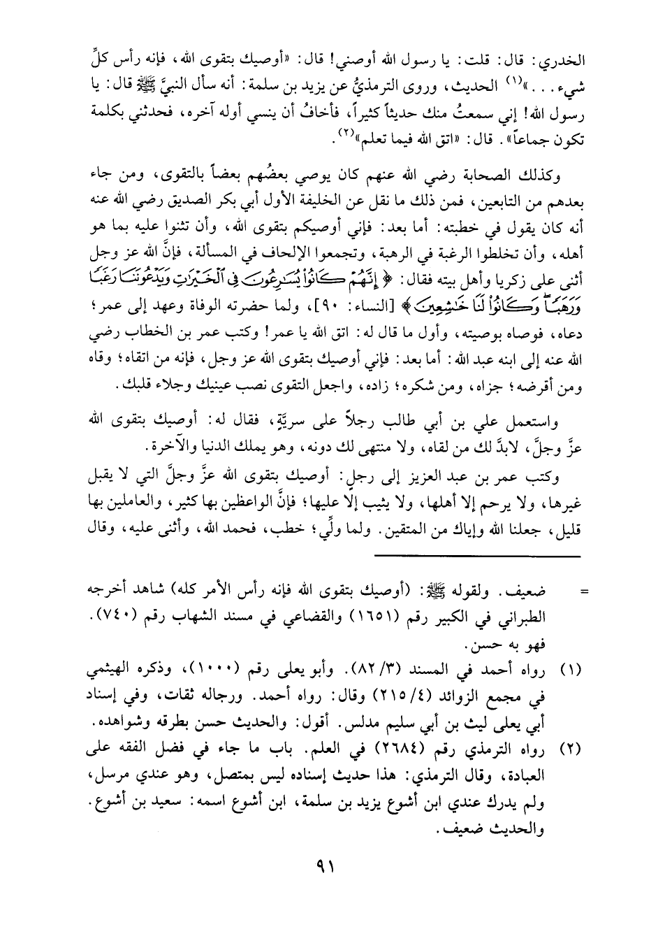 الخدري: قال: قال: يا رسول الله أوصني! قال: "أوصيك بتقوى الله، فإنه رأس كل شيء ... " 1 الحديث، وروي الترمذي عن يزيد بن سلمة: أنه سأل النبي صلى الله عليه وسلم قال: يا رسول الله! إني سمعت منك حديثاً كثيراً، فأخاف أن ينسي أوله آخره، فحدثني بكلمة تكون جماعاً" قال "اتق الله فيما تعلم" 2.