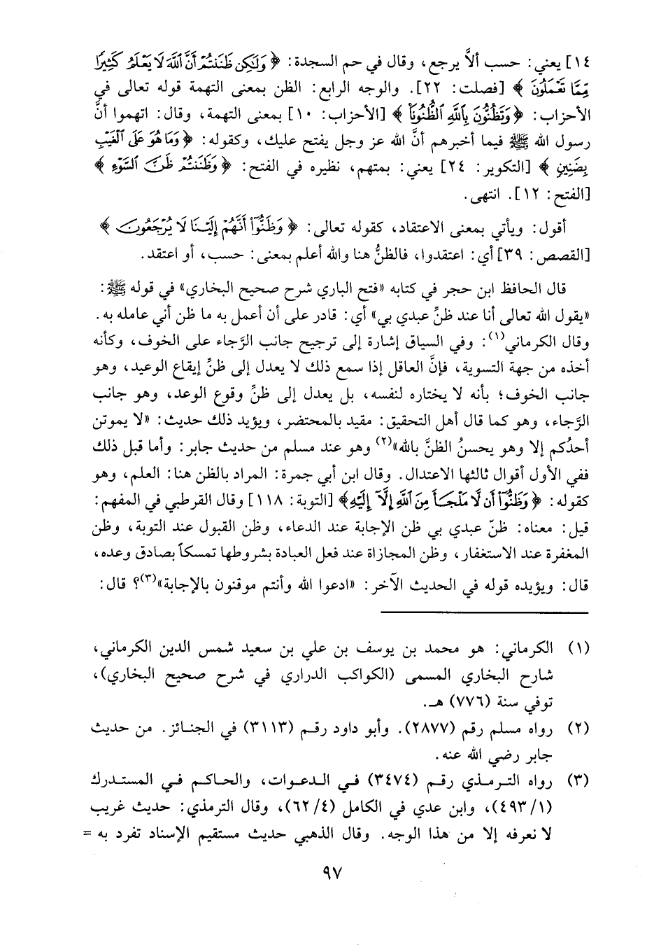 قال الحافظ ابن حجر في كتابه "فتح الباري شرح صحيح البخاري" في قوله صلى الله عليه وسلم: "يقول الله تعالى أنا عند ظن عبدي بي" أي: قادر على أن أعمل به ما ظن أني عامله به. وقال الكرماني1: وفي السياق إشارة إلى ترجيح جانب الرجاء على الخوف، وكأنه أخذه من جهة التسوية، فإن العاقل إذا سمع ذلك لا يعدل إلى ظن إيقاع الوعيد، وهو جانب الخوف بأنه لا يختاره لنفسه، بل يعدل إلى ظنِّ وقوع الوعد، وهو جانب الرجاء، وهو كما قال أهل التحقيق: مقيد بالمحتضر، ويؤيد ذلك حديث: "لا يموتن أحدُكم إلا وهو يُحسن الظن بالله" 2 وهو عند مسلم من حديث جابر: وأما قبل ذلك ففي الأول أقول ثالثها الاعتدال. وقال ابن أبي جمرة: المراد بالظن هنا: العلم، وهو كقوله: {وَظَنُّوا أَنْ لا مَلْجَأَ مِنَ اللَّهِ إِلَّا إِلَيْهِ} [التوبة:118] وقال القرطبي في المفهم: قيل: معناه: ظن عبدي بي ظن الإجابة عند الدعاء، وظن القبول عند التوبة، وظن المغفرة عند الاستغفار، وظن المجازاة عند فعل العبادة بشروطها؛ تمسكًا بصادق وعده، قال: ويؤيده قوله في الحديث الآخر: "ادعوا الله وأنتم موقنون بالإجابة" 3؟ قال:
