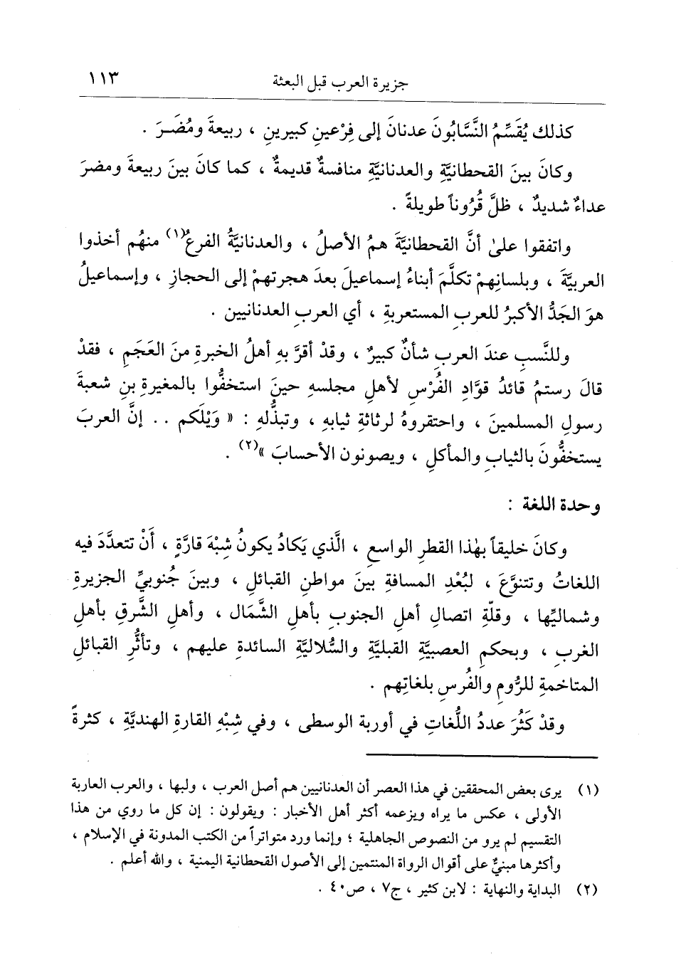 واتفقوا على أنّ القحطانيّة هم الأصل، والعدنانيّة الفرع «1» منهم أخذوا العربيّة، وبلسانهم تكلّم أبناء إسماعيل بعد هجرتهم إلى الحجاز، وإسماعيل هو الجدّ الأكبر للعرب المستعربة، أي العرب العدنانيين.