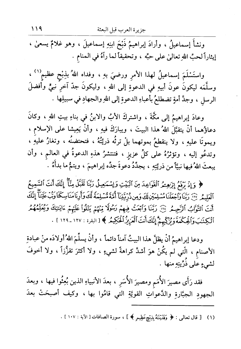 واستسلم إسماعيل لهذا الأمر ورضي به، وفداه الله بذبح عظيم «1» ، وسلّمه ليكون عون أبيه في الدعوة إلى الله، وليكون جدّ آخر نبيّ وأفضل الرسل، وجدّ أمة تضطلع بأعباء الدعوة إلى الله والجهاد في سبيلها.