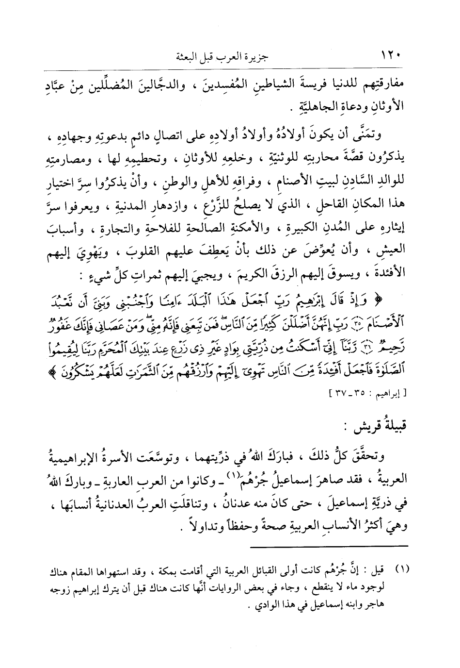 وَإِذْ قالَ إِبْراهِيمُ رَبِّ اجْعَلْ هَذَا الْبَلَدَ آمِناً وَاجْنُبْنِي وَبَنِيَّ أَنْ نَعْبُدَ الْأَصْنامَ (35) رَبِّ إِنَّهُنَّ أَضْلَلْنَ كَثِيراً مِنَ النَّاسِ فَمَنْ تَبِعَنِي فَإِنَّهُ مِنِّي وَمَنْ عَصانِي فَإِنَّكَ غَفُورٌ رَحِيمٌ (36) رَبَّنا إِنِّي أَسْكَنْتُ مِنْ ذُرِّيَّتِي بِوادٍ غَيْرِ ذِي زَرْعٍ عِنْدَ بَيْتِكَ الْمُحَرَّمِ رَبَّنا لِيُقِيمُوا الصَّلاةَ فَاجْعَلْ أَفْئِدَةً مِنَ النَّاسِ تَهْوِي إِلَيْهِمْ وَارْزُقْهُمْ مِنَ الثَّمَراتِ لَعَلَّهُمْ يَشْكُرُونَ [إبراهيم: 35- 37]