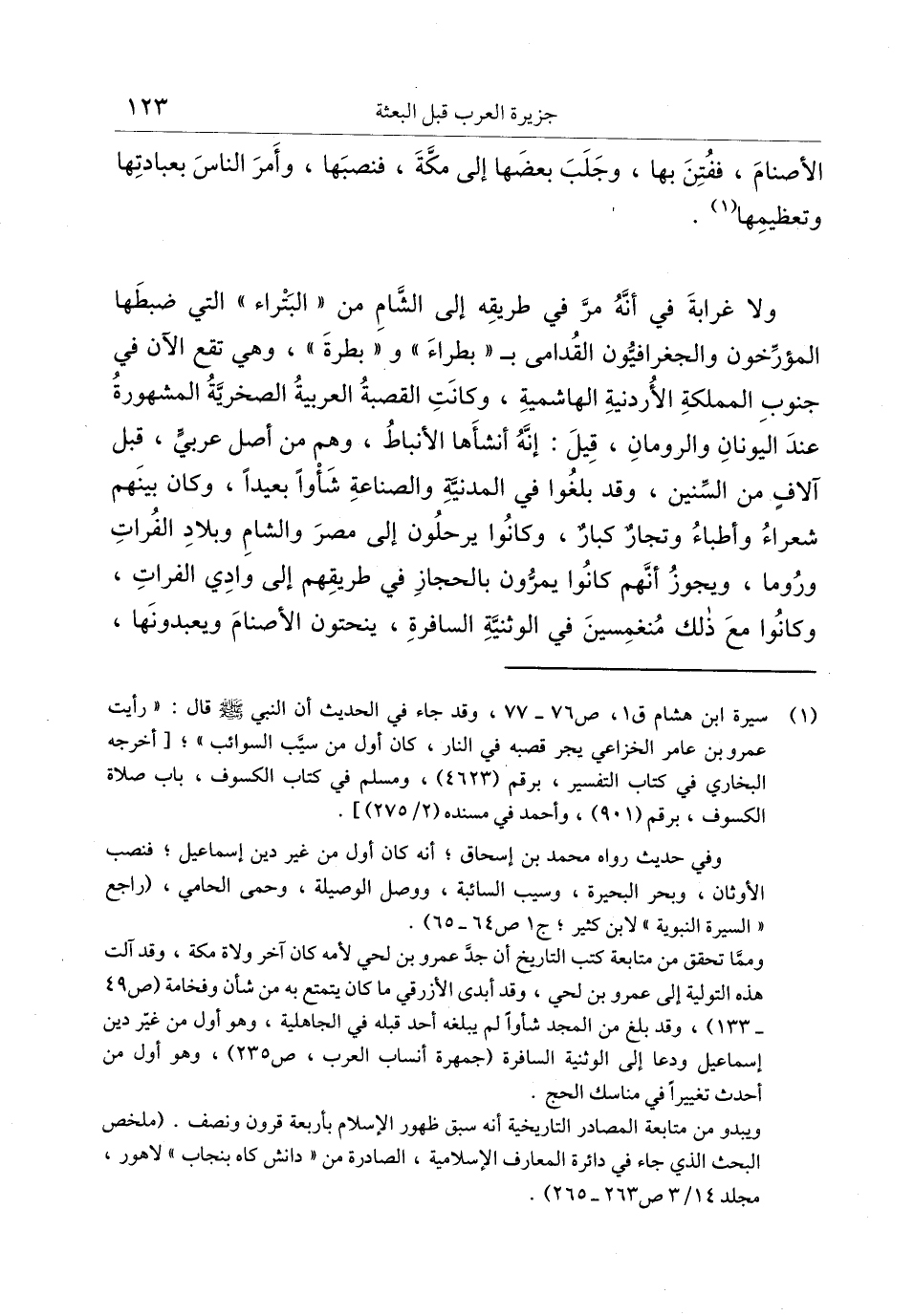 (1) سيرة ابن هشام ق 1، ص 76- 77، وقد جاء في الحديث أن النبي صلى الله عليه وسلم قال: «رأيت عمرو بن عامر الخزاعي يجر قصبه في النار، كان أول من سيّب السوائب» ؛ [أخرجه البخاري في كتاب التفسير، برقم (4623) ، ومسلم في كتاب الكسوف، باب صلاة الكسوف، برقم (901) ، وأحمد في مسنده (2/ 275) ] . وفي حديث رواه محمد بن إسحاق؛ أنه كان أول من غير دين إسماعيل؛ فنصب الأوثان، وبحر البحيرة، وسيب السائبة، ووصل الوصيلة، وحمى الحامي، (راجع «السيرة النبوية» لابن كثير؛ ج 1 ص 64- 65) . وممّا تحقق من متابعة كتب التاريخ أن جدّ عمرو بن لحي لأمه كان آخر ولاة مكة، وقد آلت هذه التولية إلى عمرو بن لحي، وقد أبدى الأزرقي ما كان يتمتع به من شأن وفخامة (ص 49 133) ، وقد بلغ من المجد شأوا لم يبلغه أحد قبله في الجاهلية، وهو أول من غيّر دين إسماعيل ودعا إلى الوثنية السافرة (جمهرة أنساب العرب، ص 235) ، وهو أول من أحدث تغييرا في مناسك الحج. ويبدو من متابعة المصادر التاريخية أنه سبق ظهور الإسلام بأربعة قرون ونصف. (ملخص البحث الذي جاء في دائرة المعارف الإسلامية، الصادرة من «دانش كاه بنجاب» لاهور، مجلد 14/ 3 ص 263- 265) .