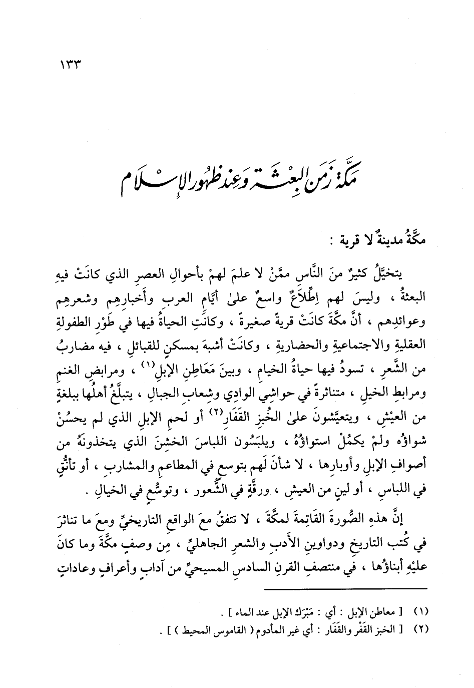 يتخيّل كثير من النّاس ممّن لا علم لهم بأحوال العصر الذي كانت فيه البعثة، وليس لهم اطّلاع واسع على أيّام العرب وأخبارهم وشعرهم وعوائدهم، أنّ مكّة كانت قرية صغيرة، وكانت الحياة فيها في طور الطفولة العقلية والاجتماعية والحضارية، وكانت أشبه بمسكن للقبائل، فيه مضارب من الشّعر، تسود فيها حياة الخيام، وبين معاطن الإبل «1» ، ومرابض الغنم ومرابط الخيل، متناثرة في حواشي الوادي وشعاب الجبال، يتبلّغ أهلها ببلغة من العيش، ويتعيّشون على الخبز القفار «2» أو لحم الإبل الذي لم يحسن شواؤه ولم يكمل استواؤه، ويلبسون اللباس الخشن الذي يتخذونه من أصواف الإبل وأوبارها، لا شأن لهم بتوسع في المطاعم والمشارب، أو تأنّق في اللباس، أو لين من العيش، ورقّة في الشّعور، وتوسّع في الخيال.