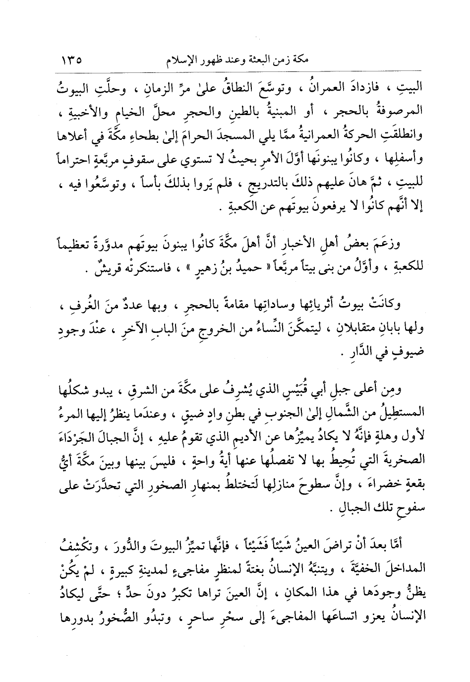 البيت، فازداد العمران، وتوسّع النطاق على مرّ الزمان، وحلّت البيوت المرصوفة بالحجر، أو المبنية بالطين والحجر محلّ الخيام والأخبية، وانطلقت الحركة العمرانية ممّا يلي المسجد الحرام إلى بطحاء مكّة في أعلاها وأسفلها، وكانوا يبنونها أوّل الأمر بحيث لا تستوي على سقوف مربّعة احتراما للبيت، ثمّ هان عليهم ذلك بالتدريج، فلم يروا بذلك بأسا، وتوسّعوا فيه، إلا أنّهم كانوا لا يرفعون بيوتهم عن الكعبة.