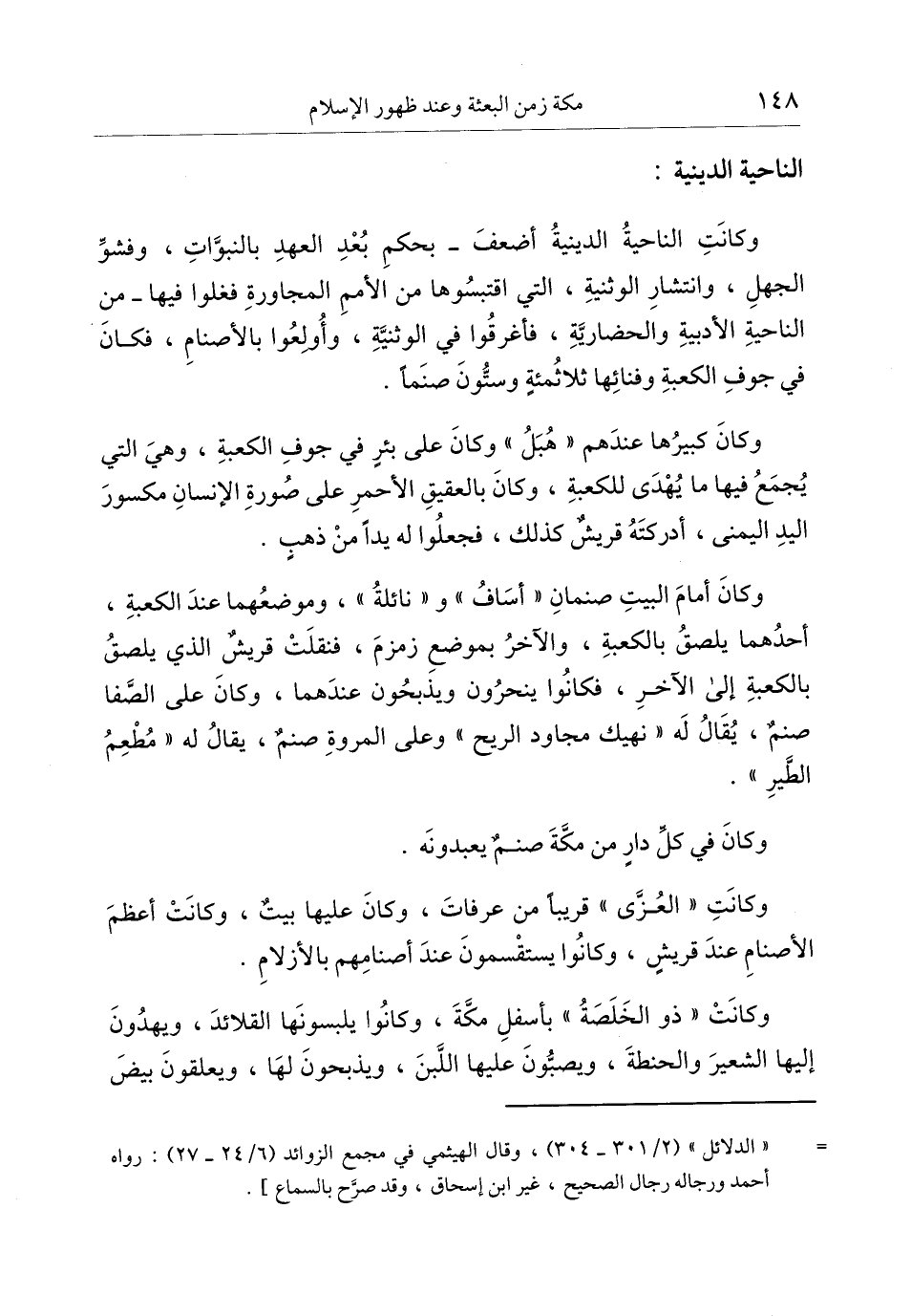 وكانت الناحية الدينية أضعف- بحكم بعد العهد بالنبوّات، وفشوّ الجهل، وانتشار الوثنية، التي اقتبسوها من الأمم المجاورة فغلوا فيها- من الناحية الأدبية والحضاريّة، فأغرقوا في الوثنيّة، وأولعوا بالأصنام، فكان في جوف الكعبة وفنائها ثلاثمئة وستّون صنما.