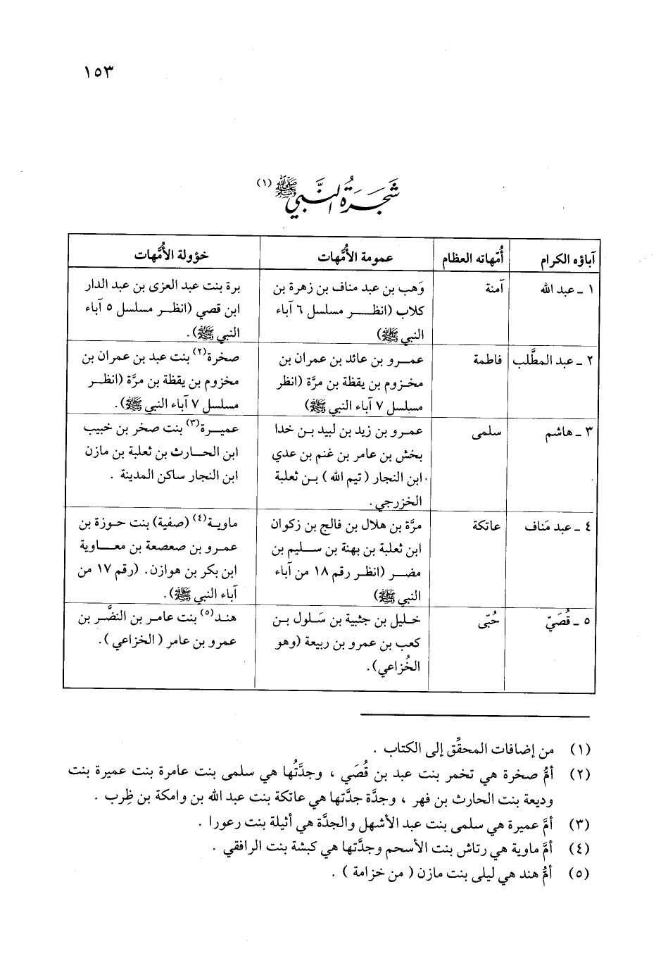 4- عبد مناف عاتكة مرّة بن هلال بن فالج بن زكوان ابن ثعلبة بن بهنة بن سليم بن مضر (انظر رقم 18 من آباء النبي صلى الله عليه وسلم) ماوية «4» (صفية) بنت حوزة بن عمرو بن صعصعة بن معاوية ابن بكر بن هوازن. (رقم 17 من آباء النبي صلى الله عليه وسلم) .