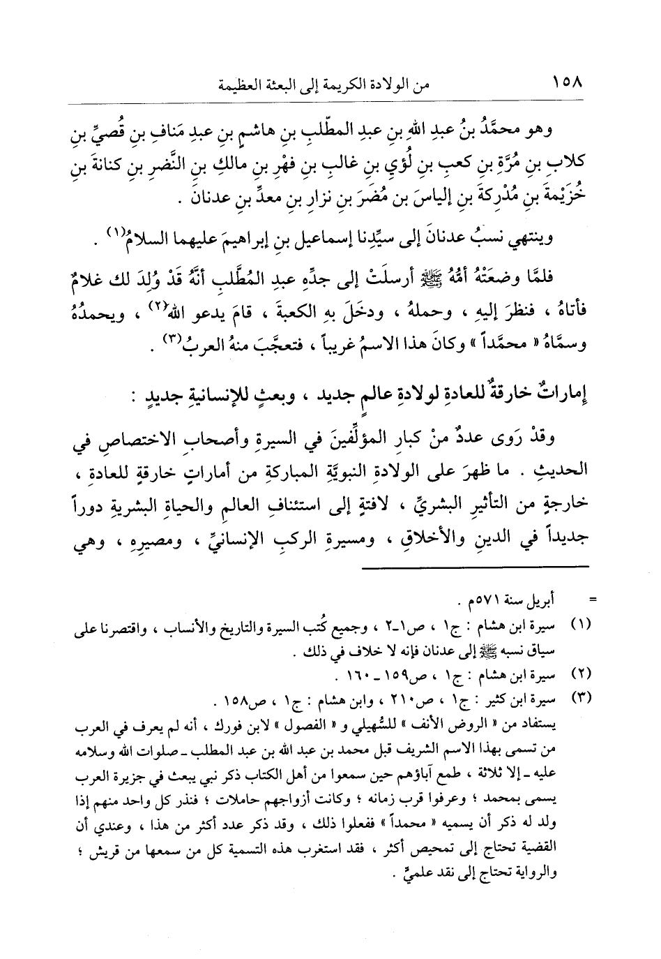 (3) سيرة ابن كثير: ج 1، ص 210، وابن هشام: ج 1، ص 158. يستفاد من «الروض الأنف» للسّهيلي و «الفصول» لابن فورك، أنه لم يعرف في العرب من تسمى بهذا الاسم الشريف قبل محمد بن عبد الله بن عبد المطلب- صلوات الله وسلامه عليه- إلا ثلاثة، طمع آباؤهم حين سمعوا من أهل الكتاب ذكر نبي يبعث في جزيرة العرب يسمى بمحمد؛ وعرفوا قرب زمانه؛ وكانت أزواجهم حاملات؛ فنذر كل واحد منهم إذا ولد له ذكر أن يسميه «محمدا» ففعلوا ذلك، وقد ذكر عدد أكثر من هذا، وعندي أن القضية تحتاج إلى تمحيص أكثر، فقد استغرب هذه التسمية كل من سمعها من قريش؛ والرواية تحتاج إلى نقد علميّ.