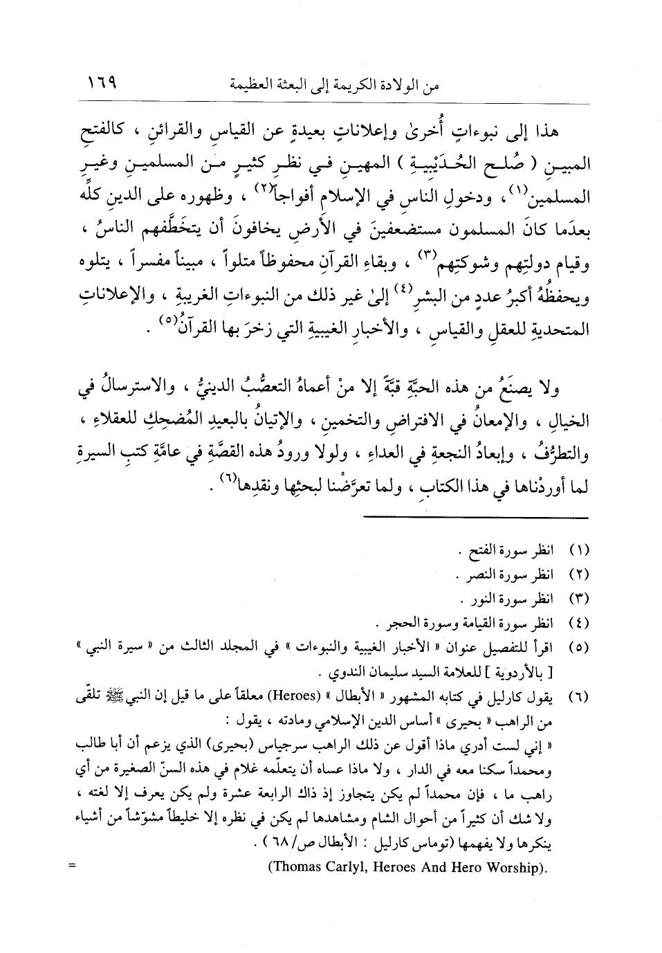 (6) يقول كارليل في كتابه المشهور «الأبطال) Heroes ( «معلقا على ما قيل إن النبي صلى الله عليه وسلم تلقّى من الراهب «بحيرى» أساس الدين الإسلامي ومادته، يقول: «إني لست أدري ماذا أقول عن ذلك الراهب سرجياس (بحيرى) الذي يزعم أن أبا طالب ومحمدا سكنا معه في الدار، ولا ماذا عساه أن يتعلّمه غلام في هذه السنّ الصغيرة من أي راهب ما، فإن محمدا لم يكن يتجاوز إذ ذاك الرابعة عشرة ولم يكن يعرف إلا لغته، ولا شك أن كثيرا من أحوال الشام ومشاهدها لم يكن في نظره إلا خليطا مشوّشا من أشياء ينكرها ولا يفهمها (توماس كارليل: الأبطال ص -) Thomas Carlyl ,Heroes And Hero Worship (.. (68 /
