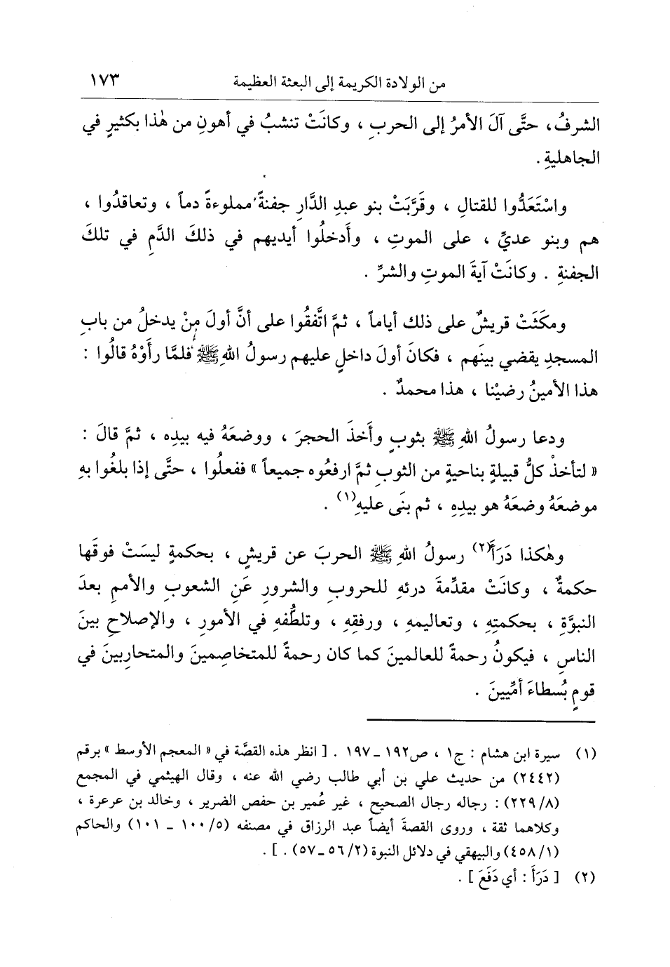 وهكذا درأ «2» رسول الله صلى الله عليه وسلم الحرب عن قريش، بحكمة ليست فوقها حكمة، وكانت مقدّمة درئه للحروب والشرور عن الشعوب والأمم بعد النبوّة، بحكمته، وتعاليمه، ورفقه، وتلطّفه في الأمور، والإصلاح بين الناس، فيكون رحمة للعالمين كما كان رحمة للمتخاصمين والمتحاربين في قوم بسطاء أمّيين.