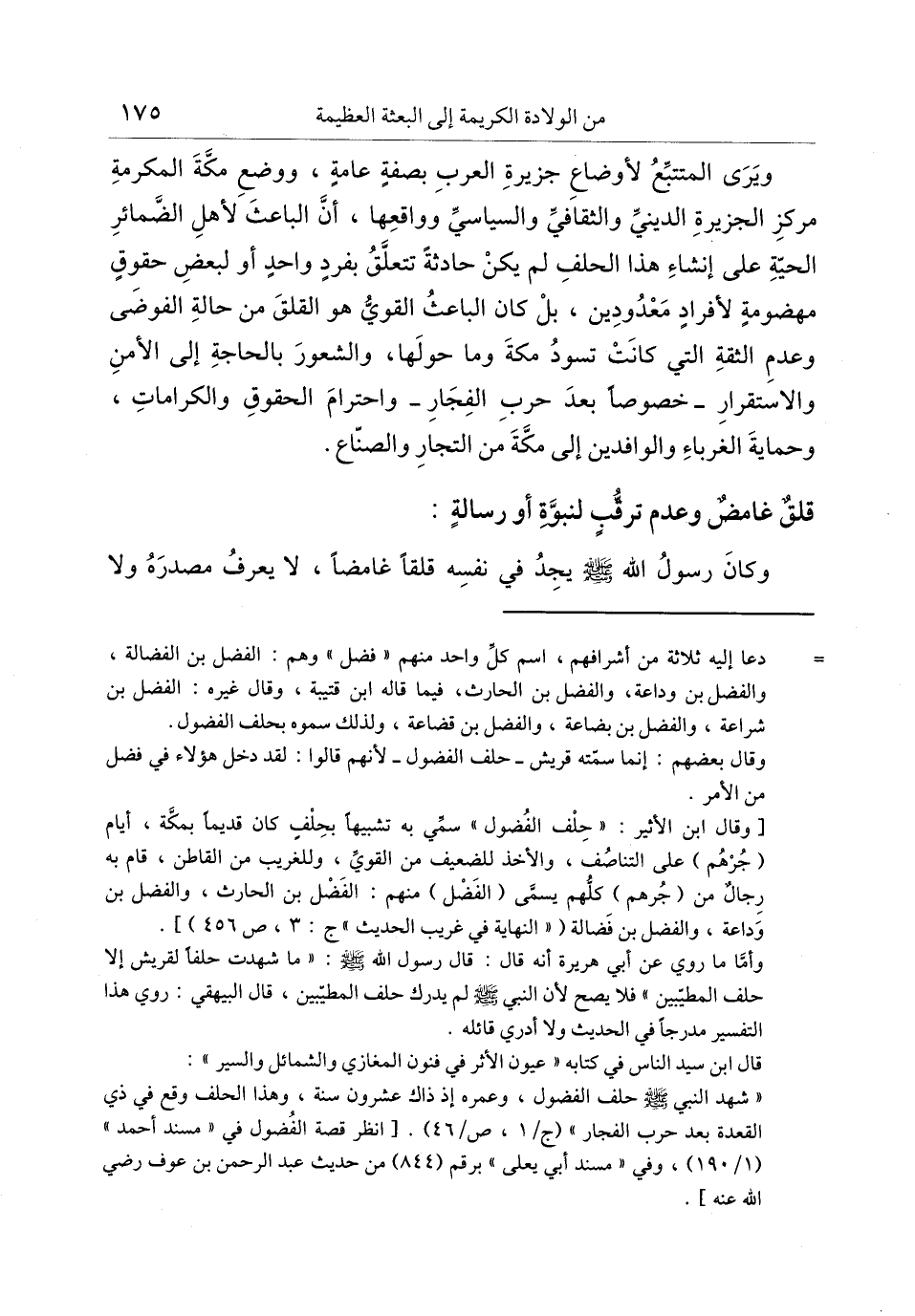 - دعا إليه ثلاثة من أشرافهم، اسم كلّ واحد منهم «فضل» وهم: الفضل بن الفضالة، والفضل بن وداعة، والفضل بن الحارث، فيما قاله ابن قتيبة، وقال غيره: الفضل بن شراعة، والفضل بن بضاعة، والفضل بن قضاعة، ولذلك سموه بحلف الفضول. وقال بعضهم: إنما سمّته قريش- حلف الفضول- لأنهم قالوا: لقد دخل هؤلاء في فضل من الأمر. [وقال ابن الأثير: «حلف الفضول» سمّي به تشبيها بحلف كان قديما بمكّة، أيام (جرهم) على التناصف، والأخذ للضعيف من القويّ، وللغريب من القاطن، قام به رجال من (جرهم) كلّهم يسمّى (الفضل) منهم: الفضل بن الحارث، والفضل بن وداعة، والفضل بن فضالة ( «النهاية في غريب الحديث» ج: 3، ص 456) ] . وأمّا ما روي عن أبي هريرة أنه قال: قال رسول الله صلى الله عليه وسلم: «ما شهدت حلفا لقريش إلا حلف المطيّبين» فلا يصح لأن النبي صلى الله عليه وسلم لم يدرك حلف المطيّبين، قال البيهقي: روي هذا التفسير مدرجا في الحديث ولا أدري قائله. قال ابن سيد الناس في كتابه «عيون الأثر في فنون المغازي والشمائل والسير» : «شهد النبي صلى الله عليه وسلم حلف الفضول، وعمره إذ ذاك عشرون سنة، وهذا الحلف وقع في ذي القعدة بعد حرب الفجار» (ج/ 1، ص/ 46) . [انظر قصة الفضول في «مسند أحمد» (1/ 190) ، وفي «مسند أبي يعلى» برقم (844) من حديث عبد الرحمن بن عوف رضي الله عنه] .