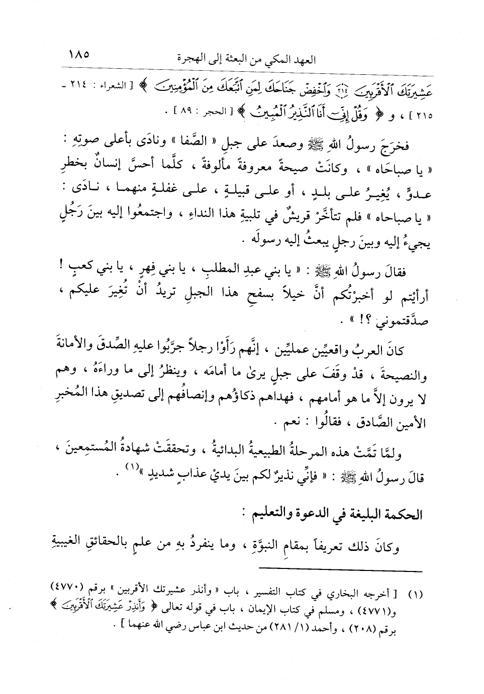 عَشِيرَتَكَ الْأَقْرَبِينَ (214) وَاخْفِضْ جَناحَكَ لِمَنِ اتَّبَعَكَ مِنَ الْمُؤْمِنِينَ [الشعراء: 214- 215] ، ووَ قُلْ إِنِّي أَنَا النَّذِيرُ الْمُبِينُ [الحجر: 89] .