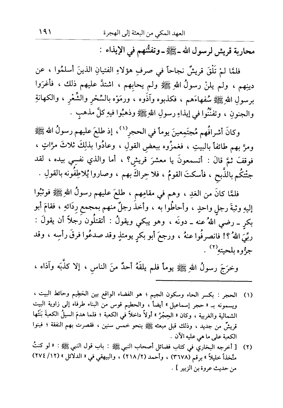 (1) الحجر: بكسر الحاء وسكون الجيم؛ هو الفضاء الواقع بين الحطيم وحائط البيت، ويسمونه ب «حجر إسماعيل» أيضا، والحطيم قوس من البناء طرفاه إلى زاوية البيت الشمالية والغربية، وكان «الحجر» أولا داخلا في الكعبة؛ فلما هدم السيل الكعبة بنتها قريش من جديد، وذلك قبل مبعثه صلى الله عليه وسلم بنحو خمس سنين، فقصرت بهم النفقة؛ فبنوا الكعبة على ما هي عليه الآن.