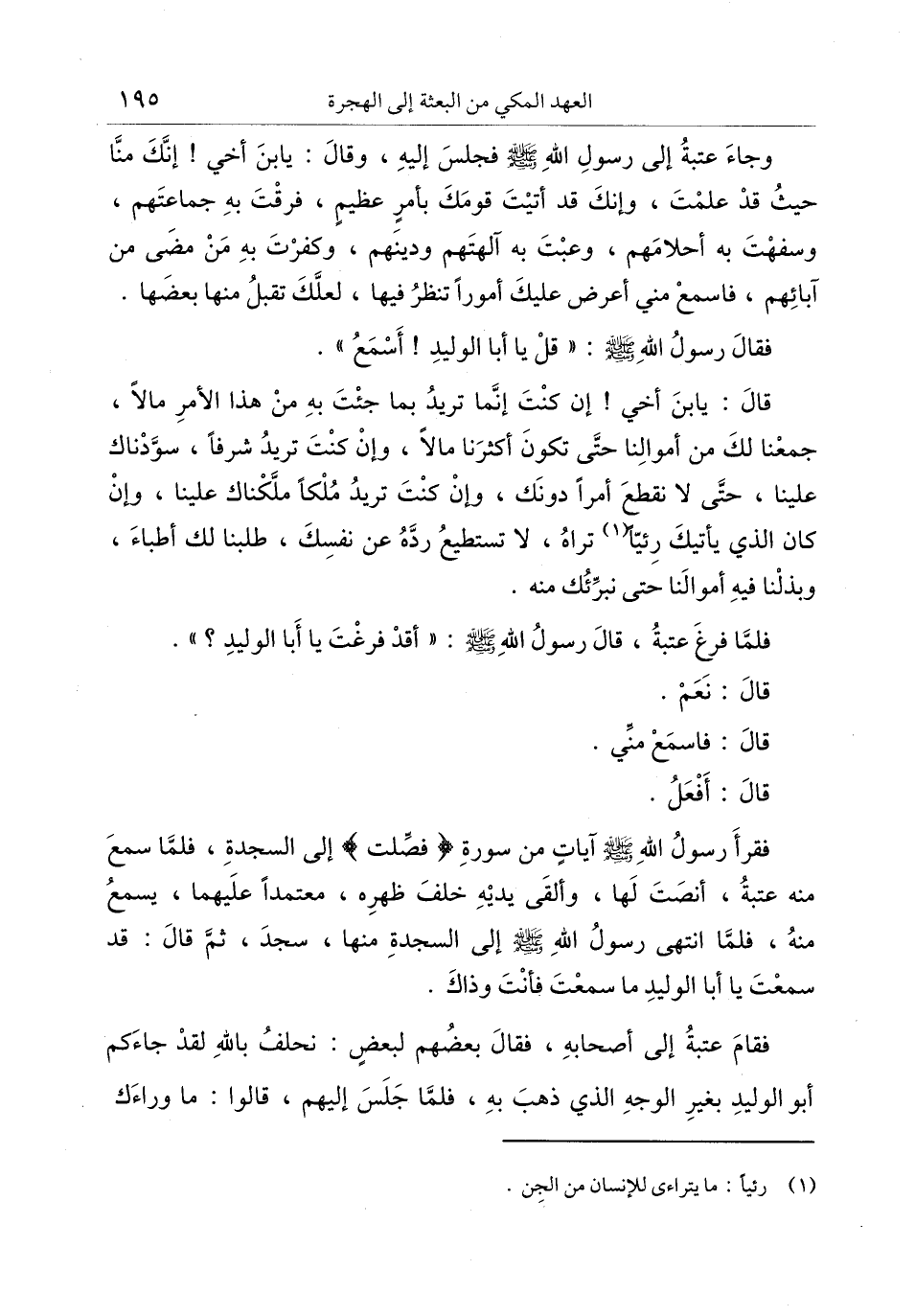 فقرأ رسول الله صلى الله عليه وسلم آيات من سورة فُصِّلَتْ إلى السجدة، فلمّا سمع منه عتبة، أنصت لها، وألقى يديه خلف ظهره، معتمدا عليهما، يسمع منه، فلمّا انتهى رسول الله صلى الله عليه وسلم إلى السجدة منها، سجد، ثمّ قال: قد سمعت يا أبا الوليد ما سمعت فأنت وذاك.