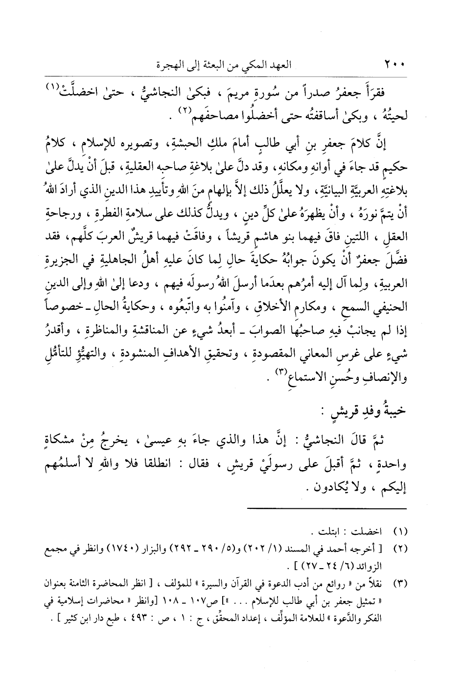 (3) نقلا من «روائع من أدب الدعوة في القرآن والسيرة» للمؤلف، [انظر المحاضرة الثامنة بعنوان «تمثيل جعفر بن أبي طالب للإسلام ... » ] ص 107- 108 [وانظر «محاضرات إسلامية في الفكر والدّعوة» للعلامة المؤلّف، إعداد المحقّق، ج: 1، ص: 493، طبع دار ابن كثير] .