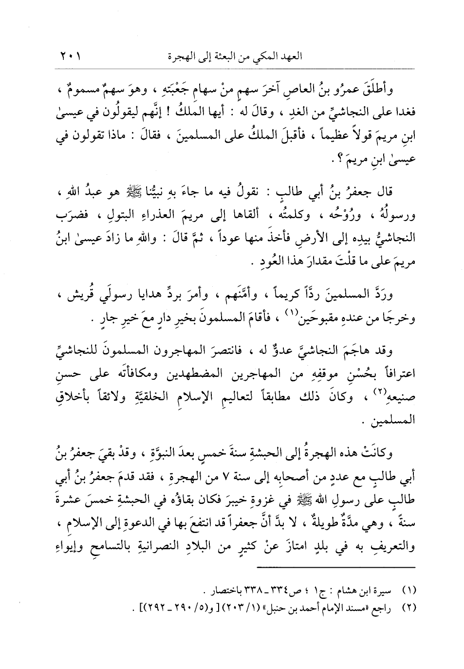 وقد هاجم النجاشيّ عدوّ له، فانتصر المهاجرون المسلمون للنجاشيّ اعترافا بحسن موقفه من المهاجرين المضطهدين ومكافأته على حسن صنيعه «2» ، وكان ذلك مطابقا لتعاليم الإسلام الخلقيّة ولائقا بأخلاق المسلمين.