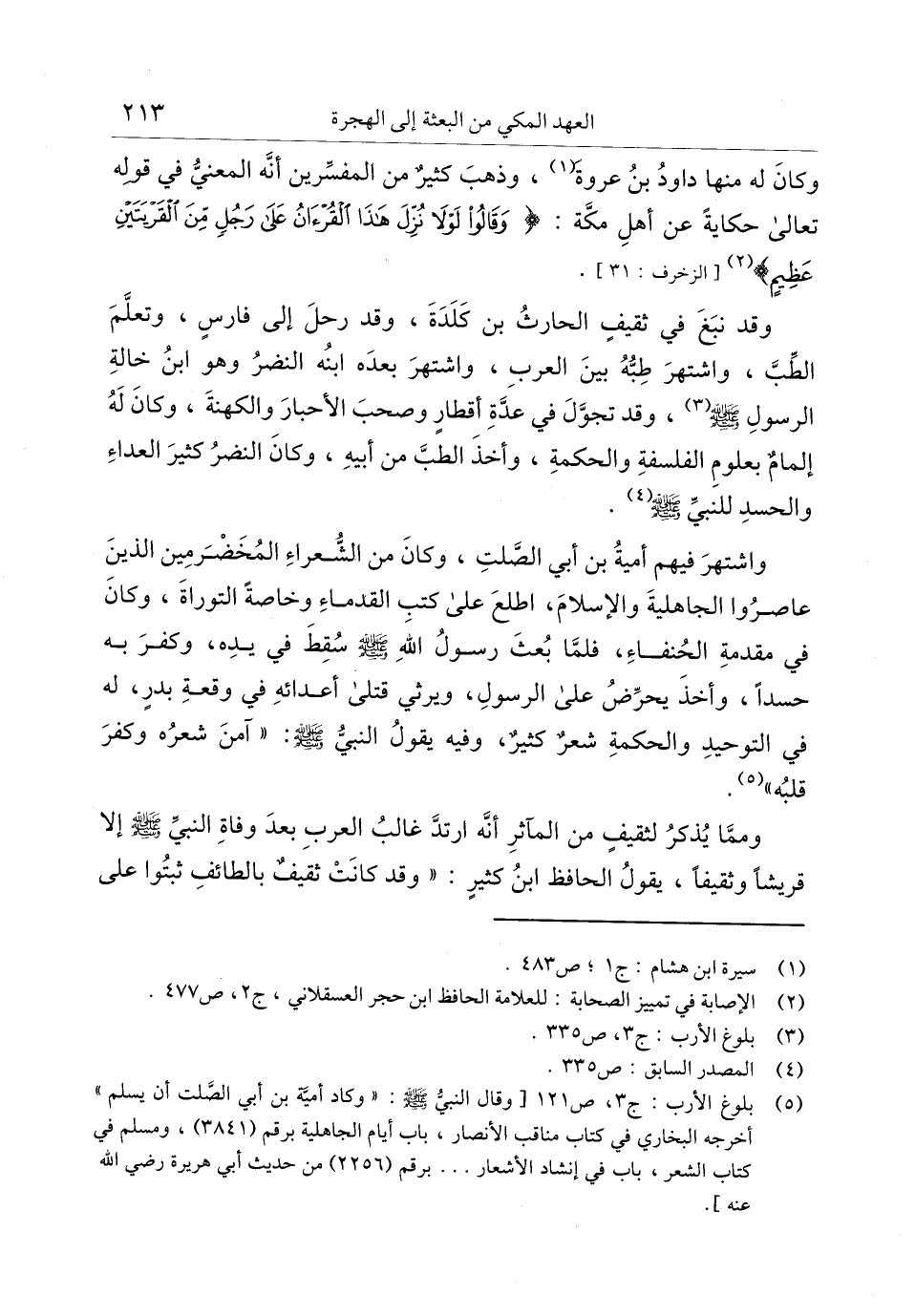 (5) بلوغ الأرب: ج 3، ص 121 [وقال النبيّ صلى الله عليه وسلم: «وكاد أميّة بن أبي الصّلت أن يسلم» أخرجه البخاري في كتاب مناقب الأنصار، باب أيام الجاهلية برقم (3841) ، ومسلم في كتاب الشعر، باب في إنشاد الأشعار ... برقم (2256) من حديث أبي هريرة رضي الله عنه] .