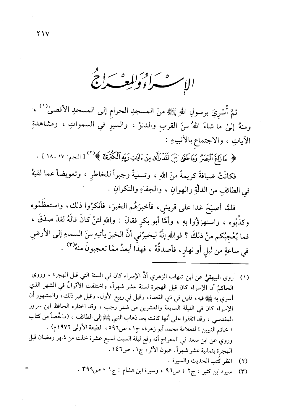 (1) روى البيهقيّ عن ابن شهاب الزهري أنّ الإسراء كان في السنة التي قبل الهجرة، وروى الحاكم أن الإسراء كان قبل الهجرة لستة عشر شهرا، واختلفت الأقوال في الشهر الذي أسري به صلى الله عليه وسلم فيه، فقيل في ذي القعدة، وقيل في ربيع الأول، وقيل غير ذلك، والمشهور أن الإسراء كان في الليلة السابعة والعشرين من شهر رجب، وقد اختاره الحافظ ابن سرور المقدسي، وقد اتفقوا على أنها كانت بعد ذهاب النبي صلى الله عليه وسلم إلى الطائف، (ملخّصا من كتاب «خاتم النبيين» للعلامة محمد أبو زهرة، ج 1، ص 596، الطبعة الأولى 1972 م) . وروي عن ابن سعد في المعراج أنه وقع ليلة السبت لسبع عشرة خلت من شهر رمضان قبل الهجرة بثمانية عشر شهرا. عيون الأثر، ج 1، ص 146.