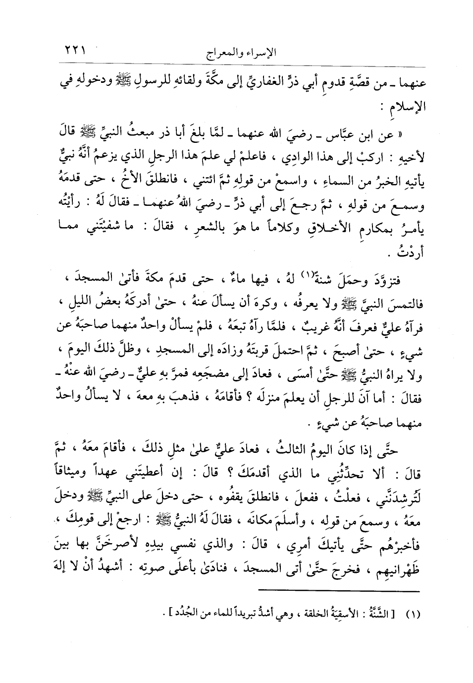 فتزوّد وحمل شنة «1» له، فيها ماء، حتى قدم مكة فأتى المسجد، فالتمس النبيّ صلى الله عليه وسلم ولا يعرفه، وكره أن يسأل عنه، حتى أدركه بعض الليل، فرآه عليّ فعرف أنّه غريب، فلمّا رآه تبعه، فلم يسأل واحد منهما صاحبه عن شيء، حتى أصبح، ثمّ احتمل قربته وزاده إلى المسجد، وظلّ ذلك اليوم، ولا يراه النبيّ صلى الله عليه وسلم حتّى أمسى، فعاد إلى مضجعه فمرّ به عليّ- رضي الله عنه- فقال: أما آن للرجل أن يعلم منزله؟ فأقامه، فذهب به معه، لا يسأل واحد منهما صاحبه عن شيء.