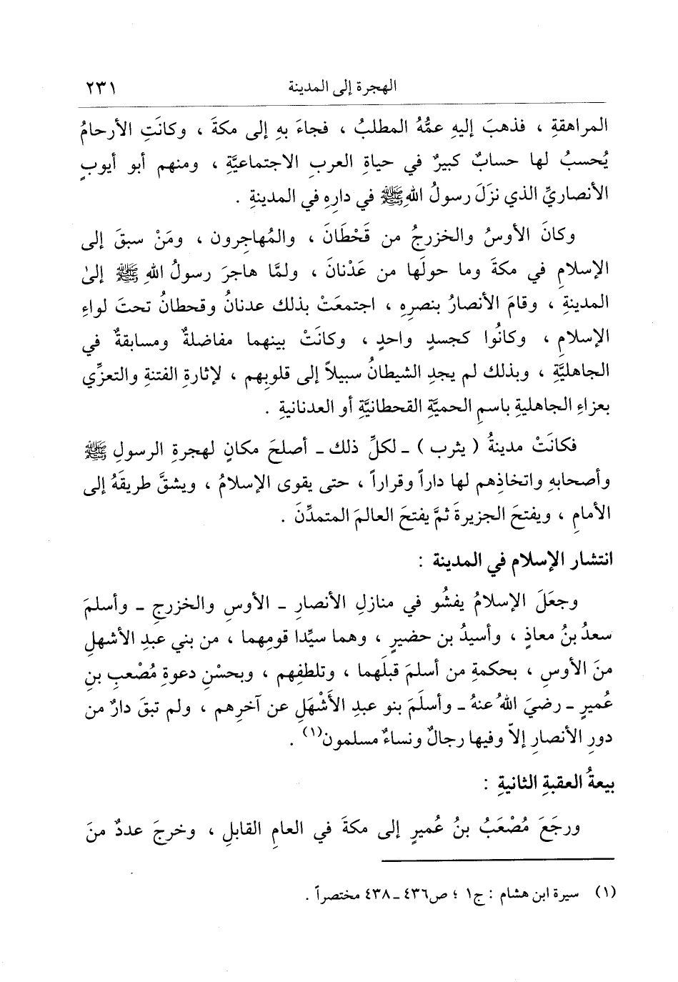 فكانت مدينة (يثرب) - لكلّ ذلك- أصلح مكان لهجرة الرسول صلى الله عليه وسلم وأصحابه واتخاذهم لها دارا وقرارا، حتى يقوى الإسلام، ويشقّ طريقه إلى الأمام، ويفتح الجزيرة ثمّ يفتح العالم المتمدّن.