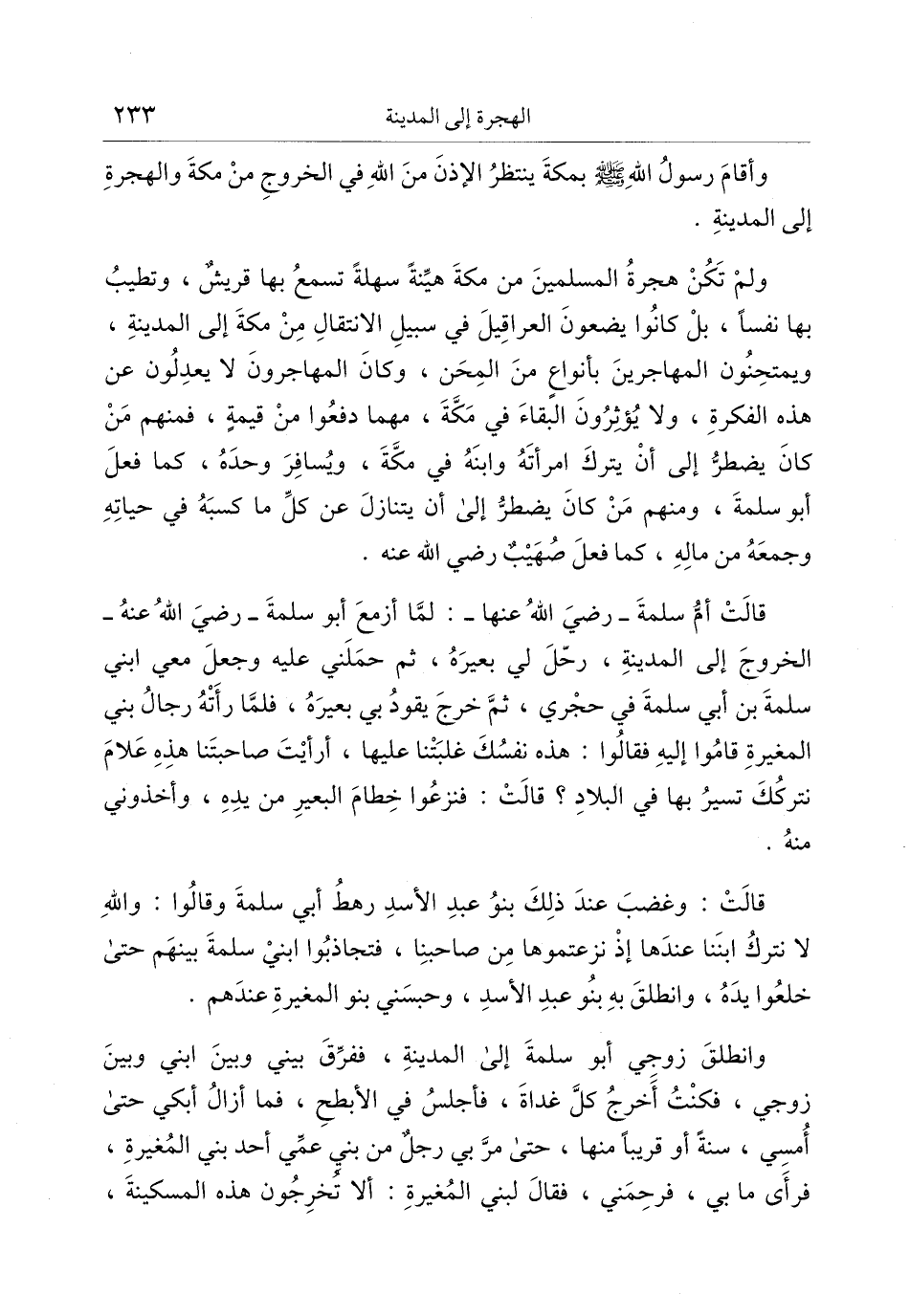 قالت أمّ سلمة- رضي الله عنها-: لمّا أزمع أبو سلمة- رضي الله عنه- الخروج إلى المدينة، رحّل لي بعيره، ثم حملني عليه وجعل معي ابني سلمة بن أبي سلمة في حجري، ثمّ خرج يقود بي بعيره، فلمّا رأته رجال بني المغيرة قاموا إليه فقالوا: هذه نفسك غلبتنا عليها، أرأيت صاحبتنا هذه علام نتركك تسير بها في البلاد؟ قالت: فنزعوا خطام البعير من يده، وأخذوني منه.