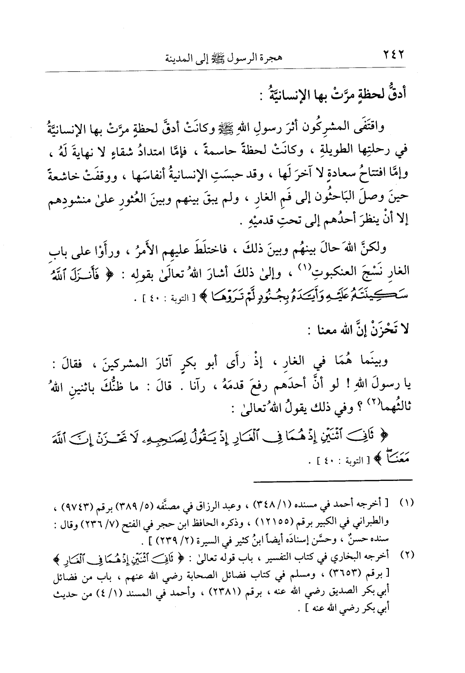 واقتفى المشركون أثر رسول الله صلى الله عليه وسلم وكانت أدقّ لحظة مرّت بها الإنسانيّة في رحلتها الطويلة، وكانت لحظة حاسمة، فإمّا امتداد شقاء لا نهاية له، وإمّا افتتاح سعادة لا آخر لها، وقد حبست الإنسانية أنفاسها، ووقفت خاشعة حين وصل الباحثون إلى فم الغار، ولم يبق بينهم وبين العثور على منشودهم إلا أن ينظر أحدهم إلى تحت قدميه.