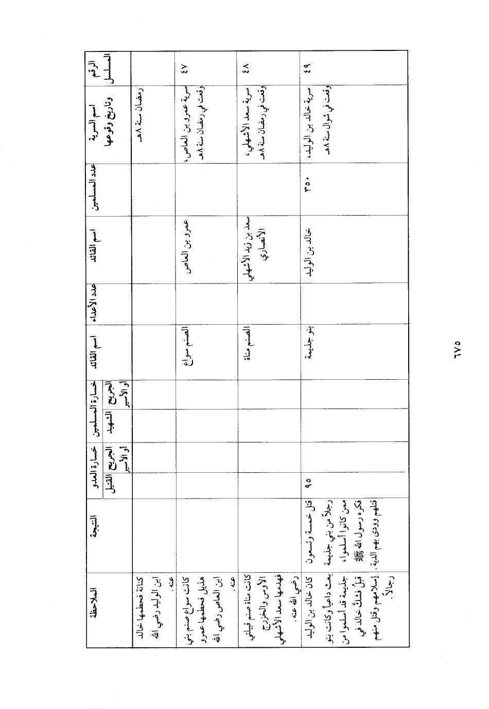 الرقم المسلسل اسم السرية وتاريخ وقوعها عدد المسلمين اسم القائد عدد الأعداء اسم القائد خسارة المسلمين الجريح أو الأسير الشهيد خسارة العدو الجريح أو الأسير القتيل النتيجة الملاحظة