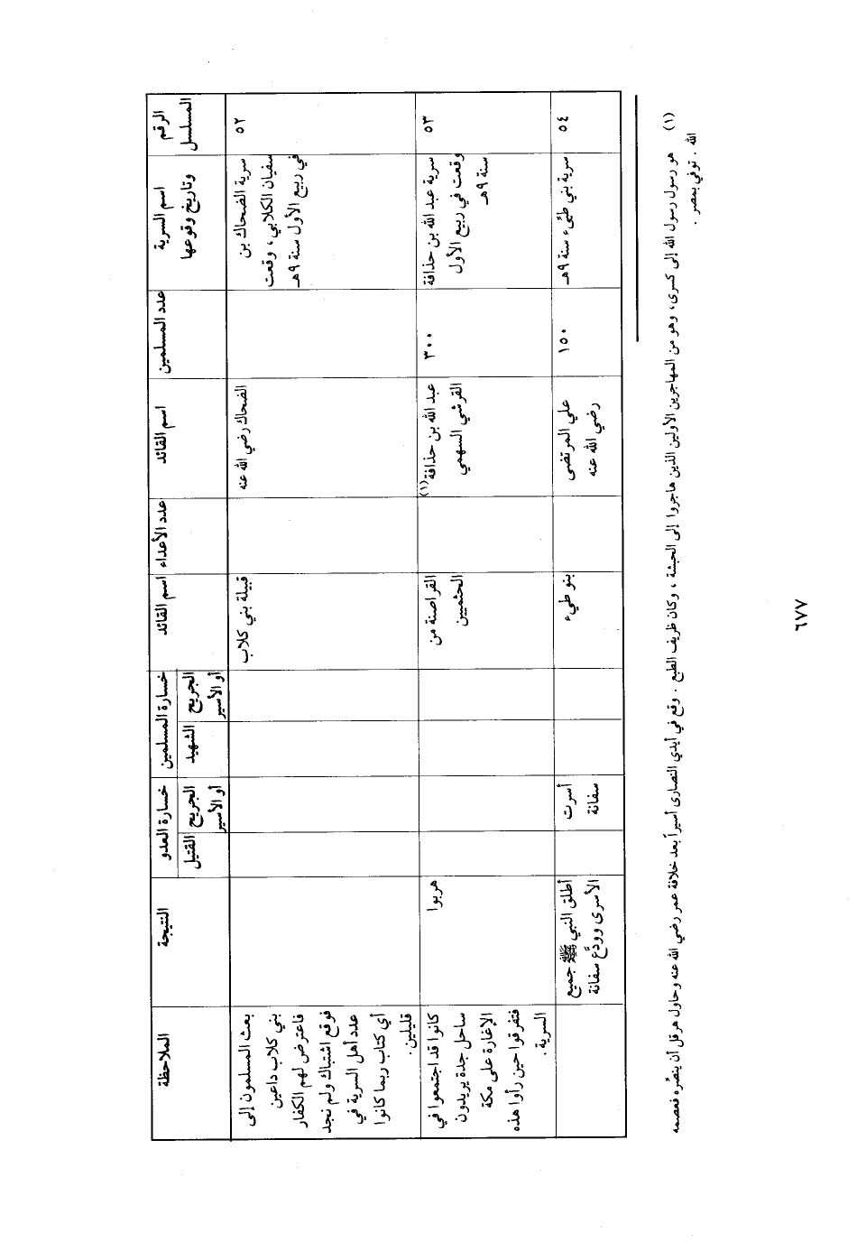 الرقم المسلسل اسم السرية وتاريخ وقوعها عدد المسلمين اسم القائد عدد الأعداء اسم القائد خسارة المسلمين الجريح أو الأسير الشهيد خسارة العدو الجريح أو الأسير القتيل النتيجة الملاحظة