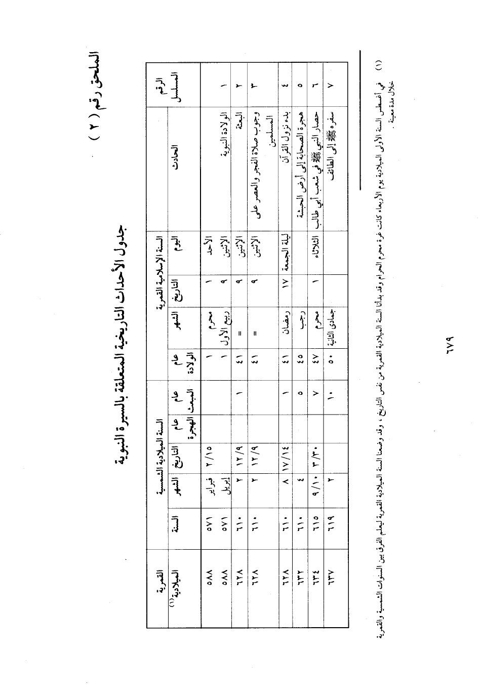 جدول الأحداث التاريخية المتعلقة بالسيرة النبوية الرقم المسلسل الحادث السنة الإسلامية القمرية اليوم التاريخ الشهر عام الولادة السنة الميلادية الشمسية عام المبعث عام الهجرة التاريخ الشهر السنة القمرية الميلادية «1»