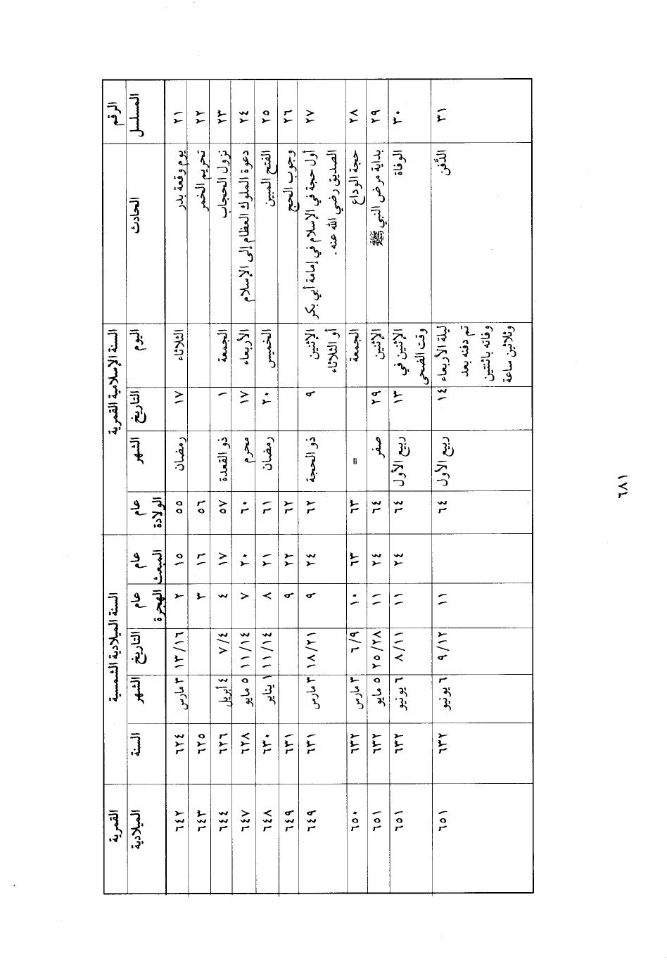 الرقم المسلسل الحادث السنة الإسلامية القمرية اليوم التاريخ الشهر عام الولادة السنة الميلادية الشمسية عام المبعث عام الهجرة التاريخ الشهر السنة القمرية الميلادية