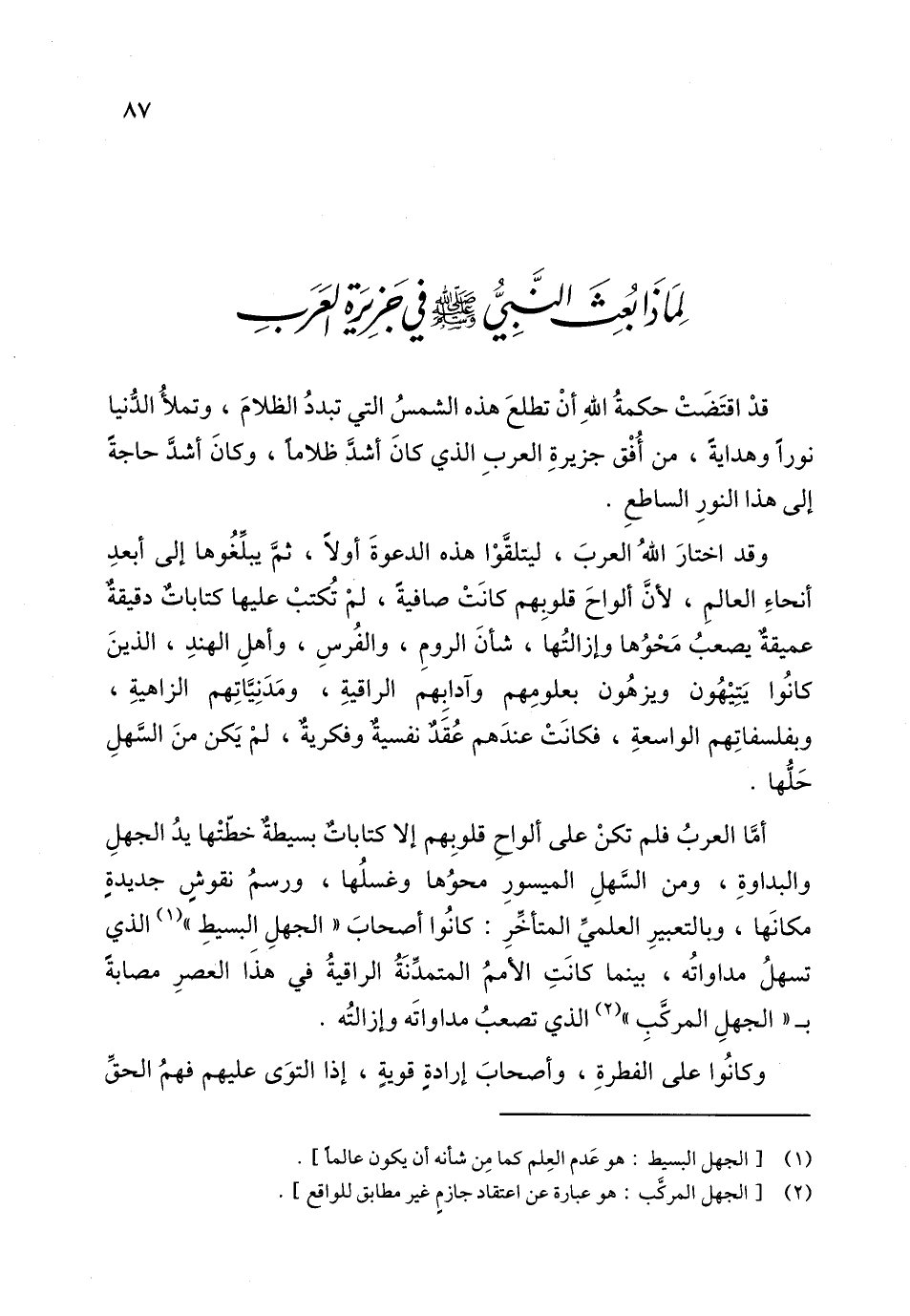أمّا العرب فلم تكن على ألواح قلوبهم إلا كتابات بسيطة خطّتها يد الجهل والبداوة، ومن السّهل الميسور محوها وغسلها، ورسم نقوش جديدة مكانها، وبالتعبير العلميّ المتأخّر: كانوا أصحاب «الجهل البسيط» «1» الذي تسهل مداواته، بينما كانت الأمم المتمدّنة الراقية في هذا العصر مصابة ب «الجهل المركّب» «2» الذي تصعب مداواته وإزالته.