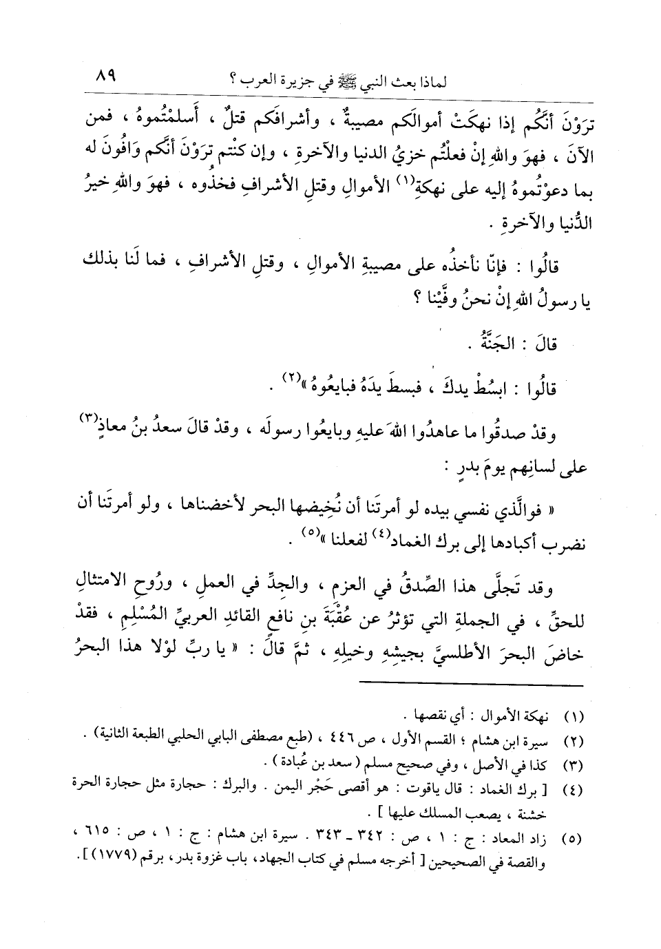 (5) زاد المعاد: ج: 1، ص: 342- 343. سيرة ابن هشام: ج: 1، ص: 615، والقصة في الصحيحين [أخرجه مسلم في كتاب الجهاد، باب غزوة بدر، برقم (1779) ] .