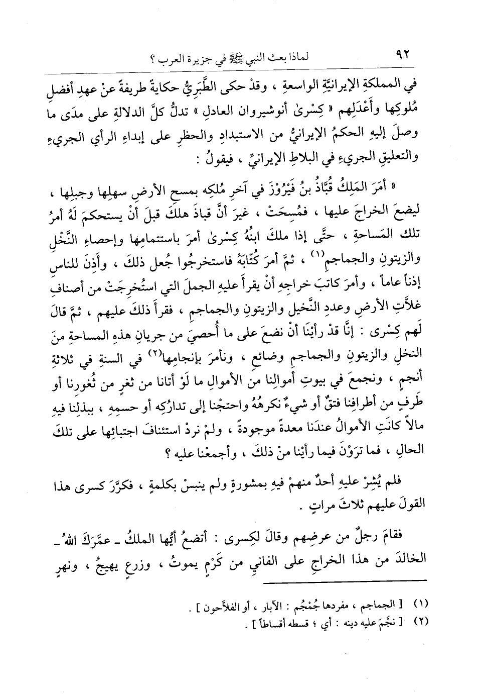 فقام رجل من عرضهم وقال لكسرى: أتضع أيّها الملك- عمّرك الله- الخالد من هذا الخراج على الفاني من كرم يموت، وزرع يهيج، ونهر