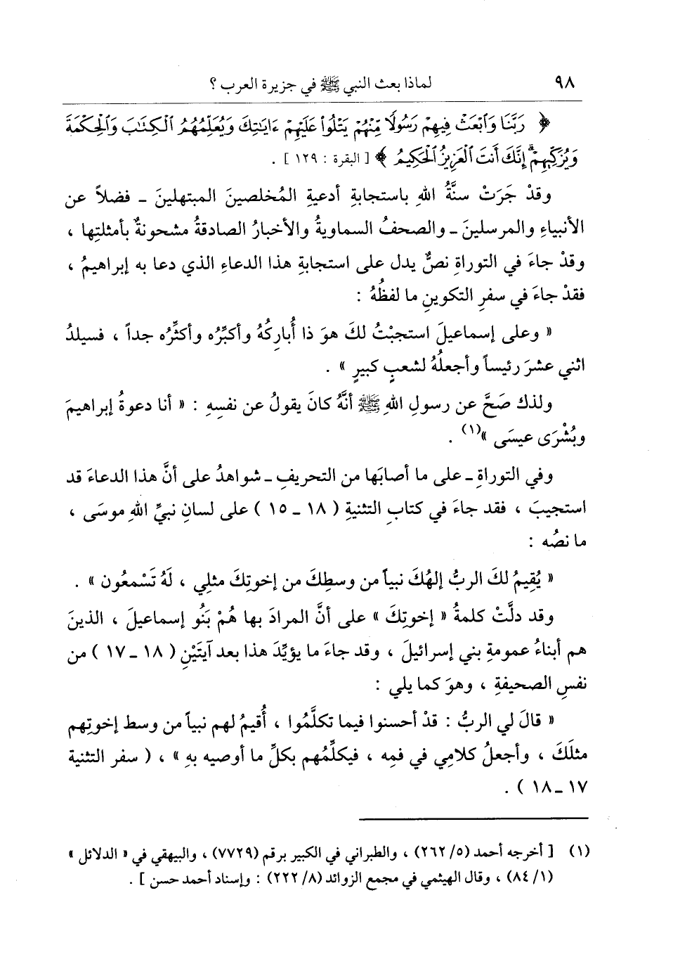 وفي التوراة- على ما أصابها من التحريف- شواهد على أنّ هذا الدعاء قد استجيب، فقد جاء في كتاب التثنية (18- 15) على لسان نبيّ الله موسى، ما نصه: