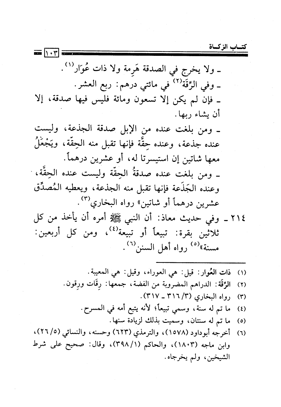 214- وَفِي حَدِيثِ مُعَاذٍ: أَنَّ اَلنَّبِيَّ -صلى الله عليه وسلم- أَمَرَهُ أَنْ يَأْخُذَ مِنْ كُلِّ ثَلَاثِينَ بَقَرَةٍ: تَبِيعًا أَوْ تَبِيعَة4، وَمِنْ كُلِّ أَرْبَعِينَ: مُسِنَّةً5، رَوَاهُ أَهْلُ اَلسُّنَن6.